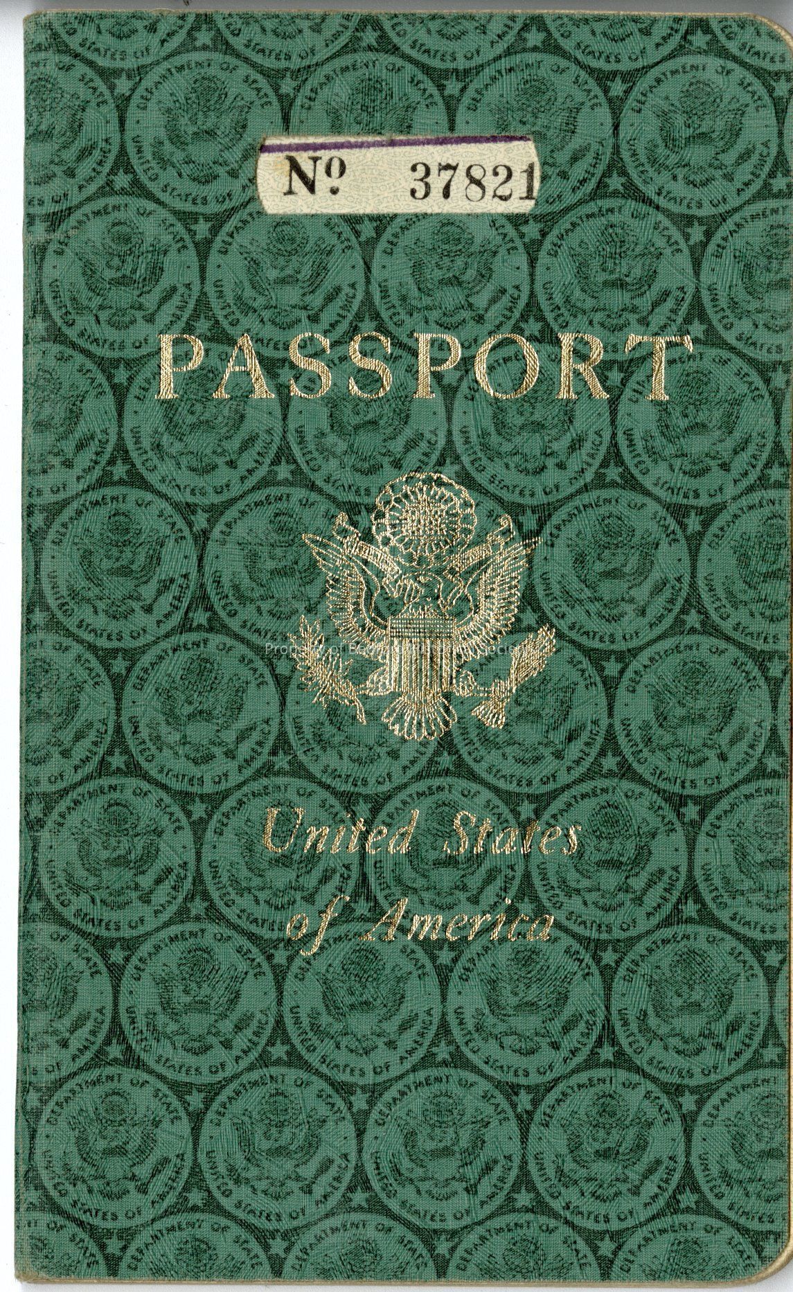 Passport of Edward Heron Sudbury and Hope Lewis Bedell. Green with repeating Eagle stamp patterns, silver block printing, and cutout at top with printed No 37821. Back of front page has signature of E.H. Sudbury, Passport also includes a black and white photo of him, as well as all of this and Hope's travel stamps from the 1940's.