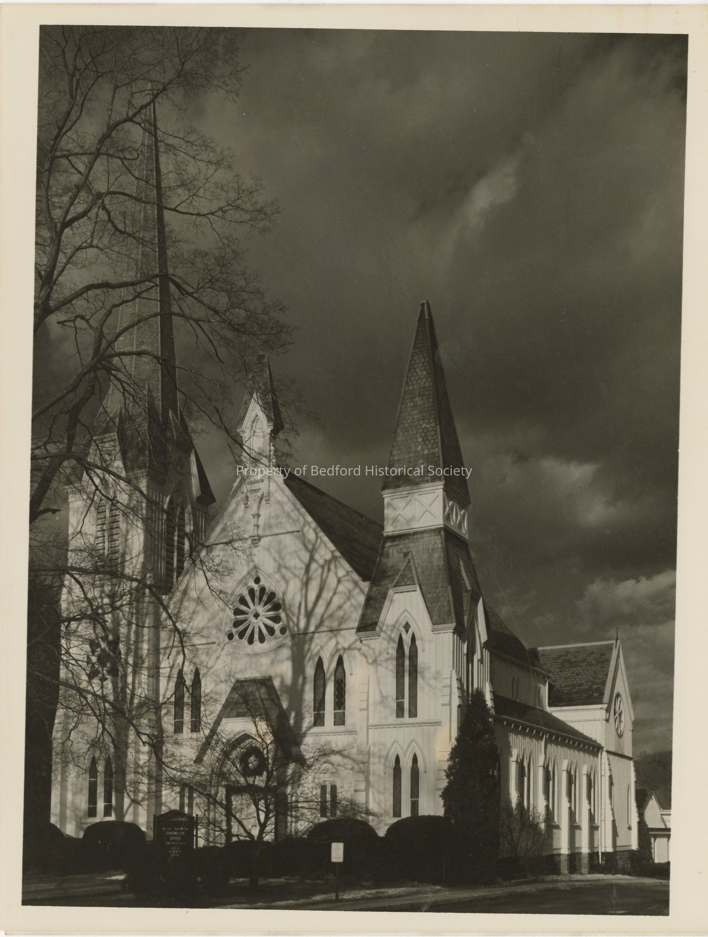 Large b + w photo of Bedford Presbyterian church, January 1976