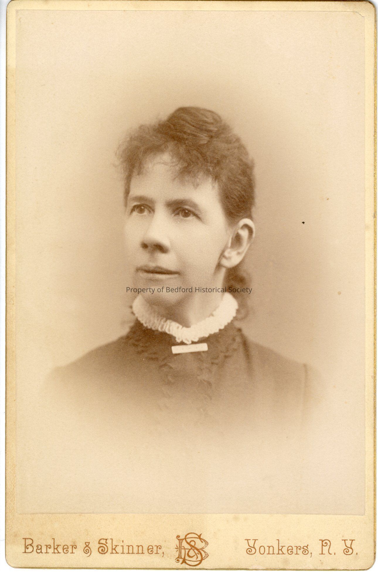 Cabinet card of Clara Benedict, 1887, dressed in black bodice with white ruffled collar