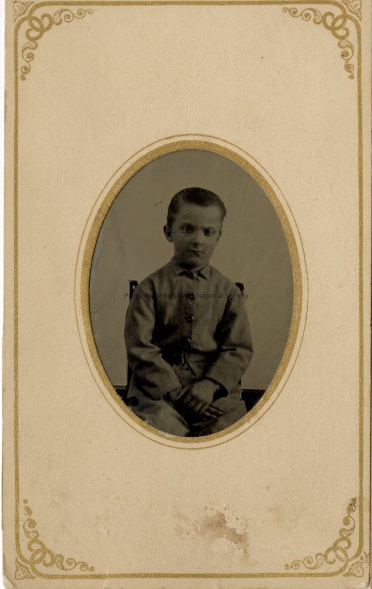 photograph of little boy sitting, housed in matte cardstock oval frame, gold decorative border around edges part of Gardner/Sarles Collection