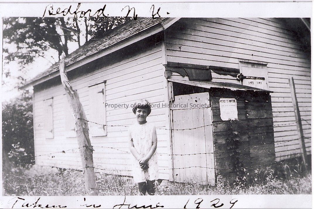 Digital scan of a photograph. Marion Florence Bentley, 7 years old, standing in front of a Bedford school house, taken in 1929.