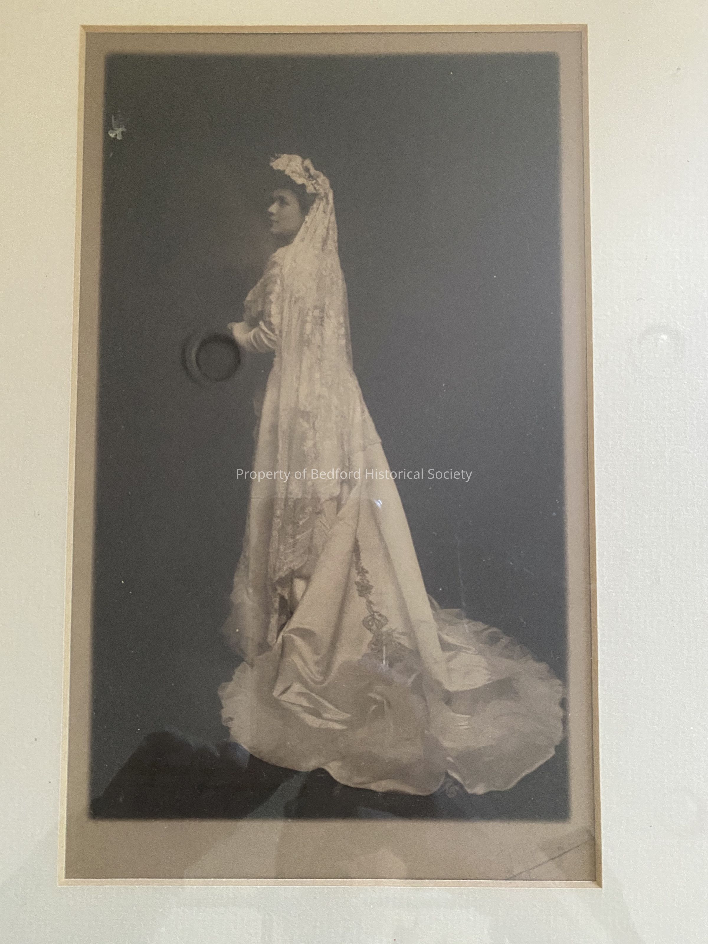 Wilhelmine Kirby (nee Wilhelmine Stewart Claflin) in her wedding dress with long train and lace veil circa 1906. Platinotype or Palladiotype *taken out of frame