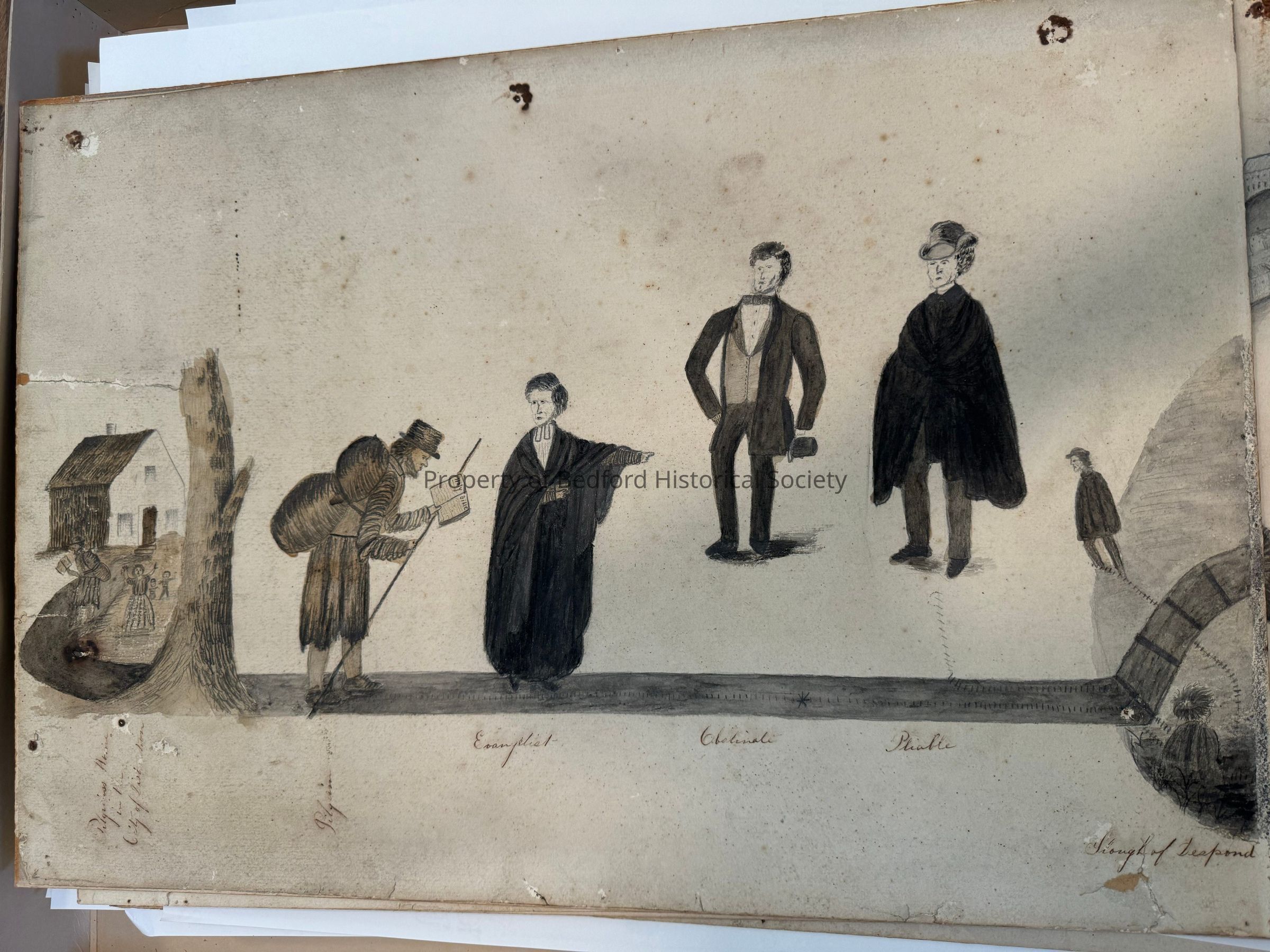 large hand illustrated pages of A Pilgrim’s Progress by a 19th century Bedford artist