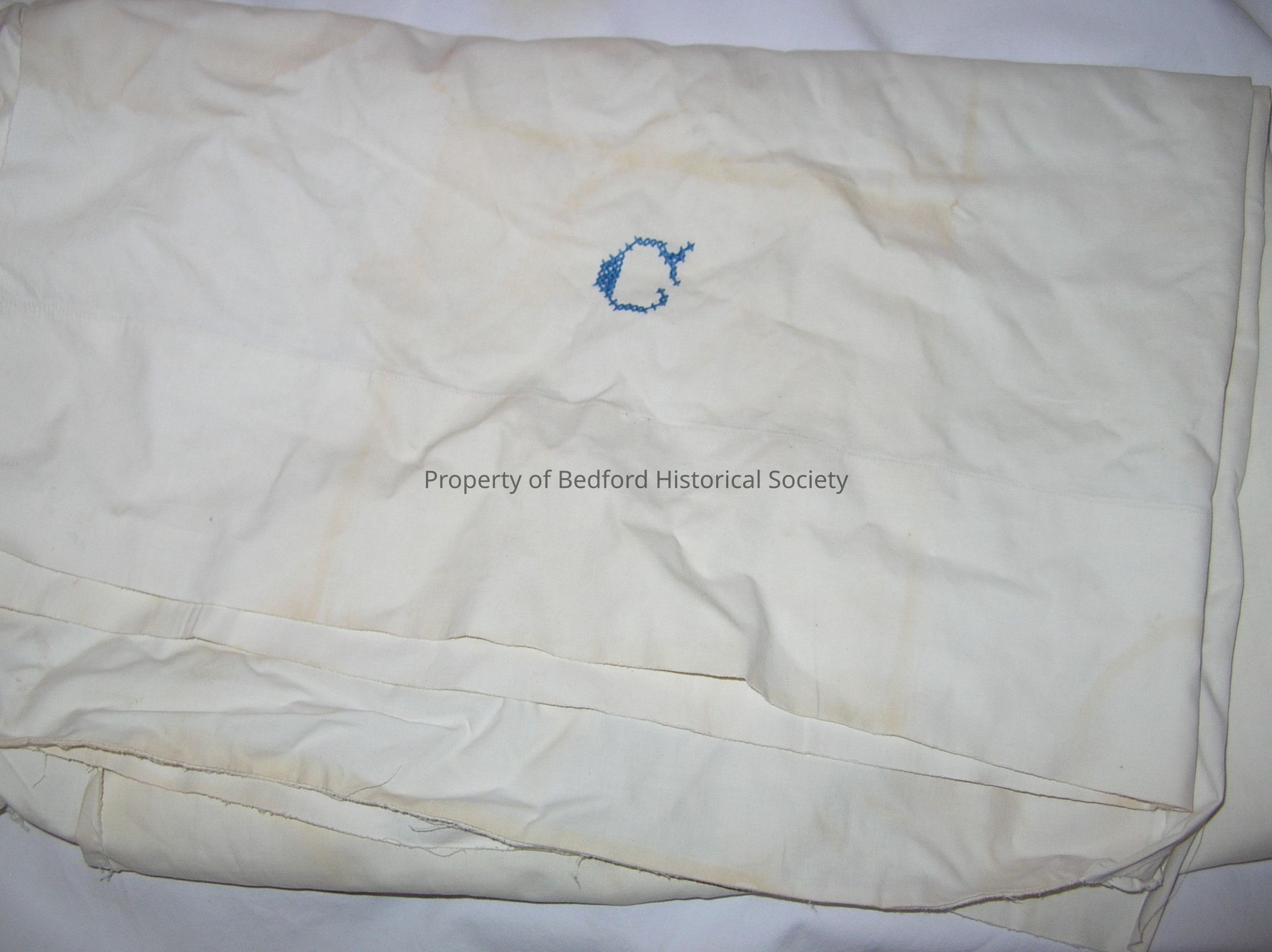 Box of Childrens clothes - ripped white pillow case with blye embroidering ( G )