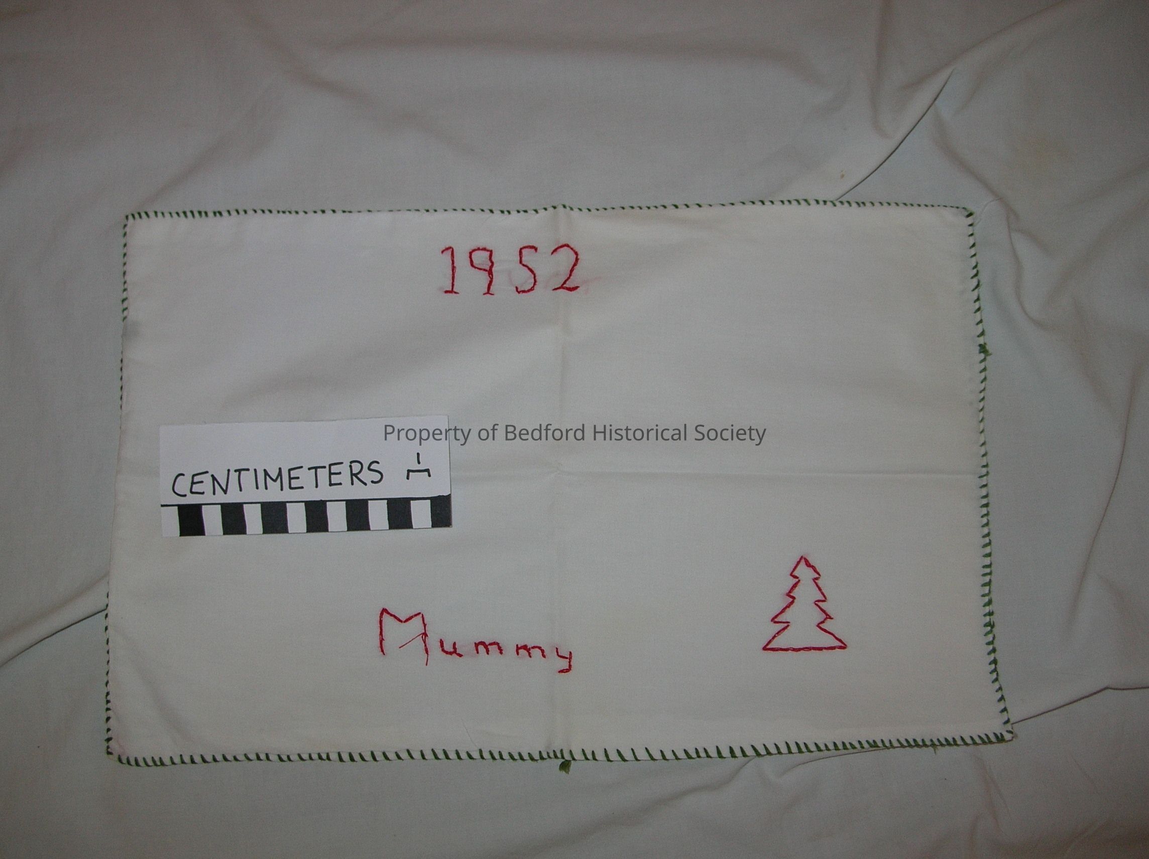 Cotton (?) pillow case with green stitching and green christmas tree, sewn in 1952, stitching reads: "Mummy" and "1952"