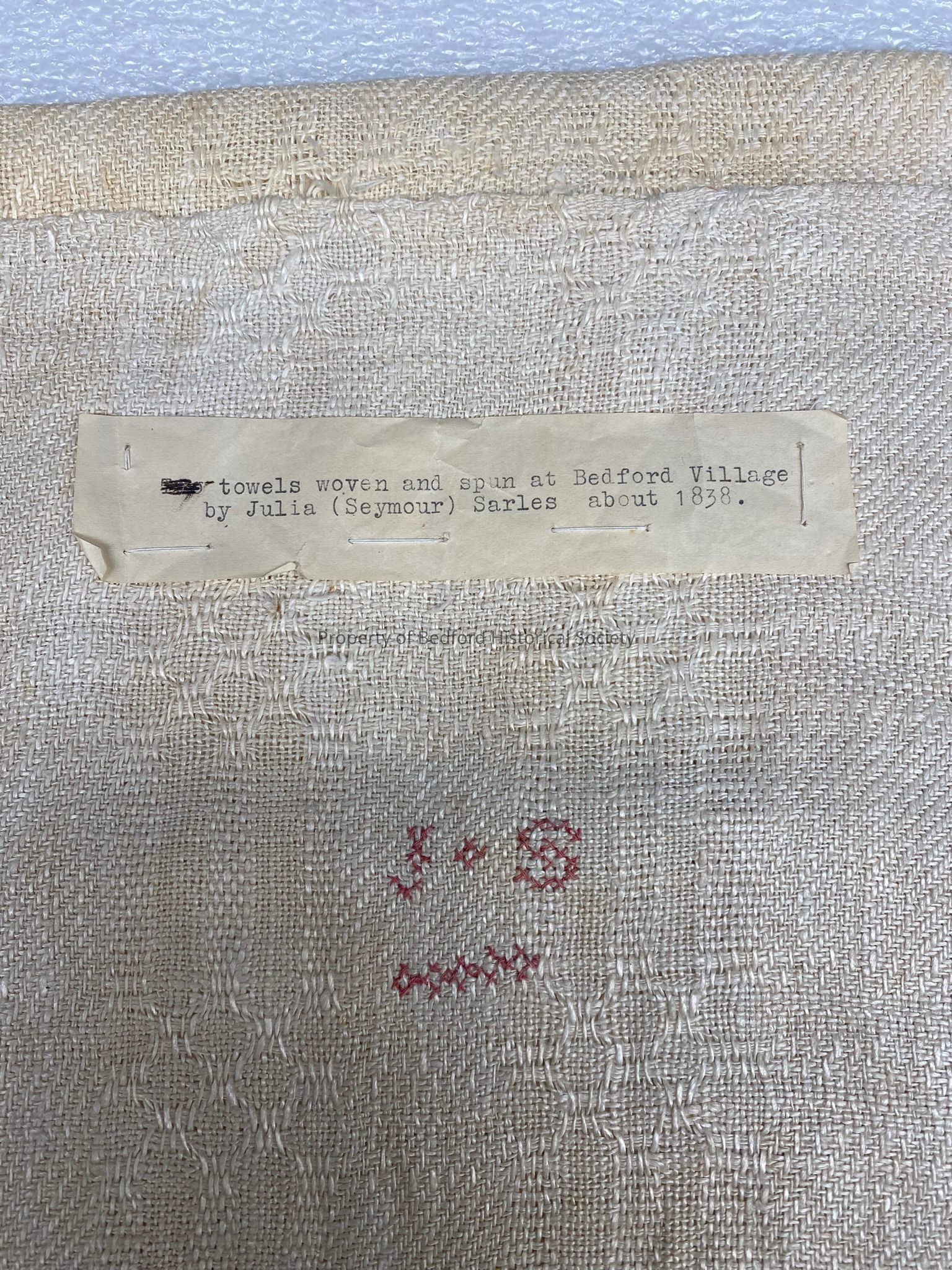 Hand towel with note “towels hand woven and spun at Bedford Village by Julia Seymour Sarles about 1838” Probably a pillow case, as other JS items look like hand towels.