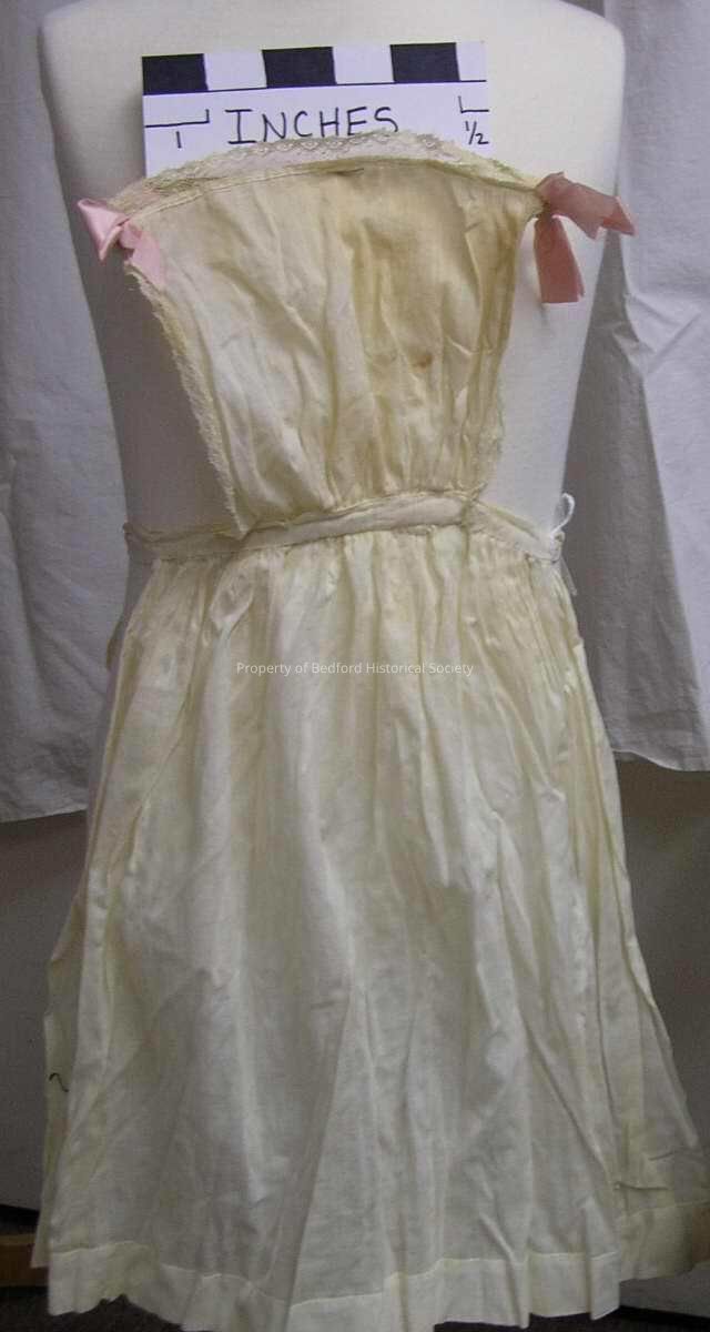 Child's pinafore, hand made, 19th century, cotton lawn edged with lace, with two pale pink bows (added later) good condition