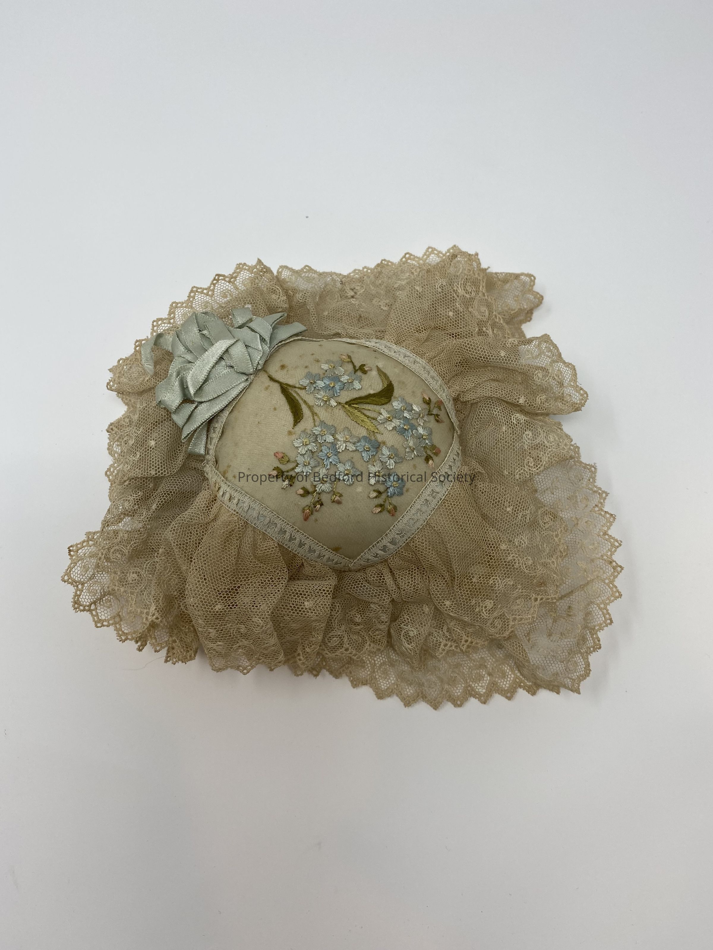 square pillow shaped lace pincushion having blue flowers, pink rosebuds and green stems embroidered in center, surrounded by light blue ribbon with white thread stictching along four sides in diomond shape with blue ribbon gathered in bow on lower left side.