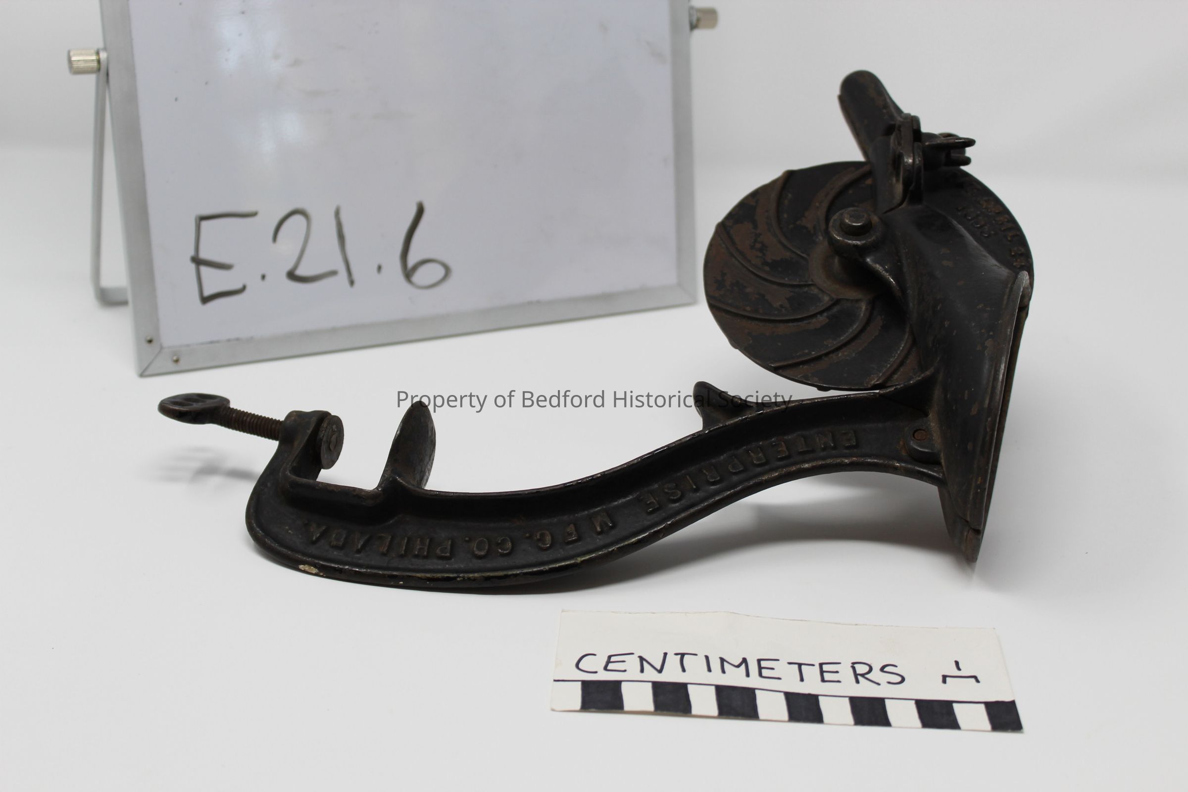 cast iron cherry stoner or pitter with words "Enterprise Cherry Stoner" in relief on one side of handle, other side "Enterprise MFG. CO. Philad. Top: Pat. April 24 1893(?)