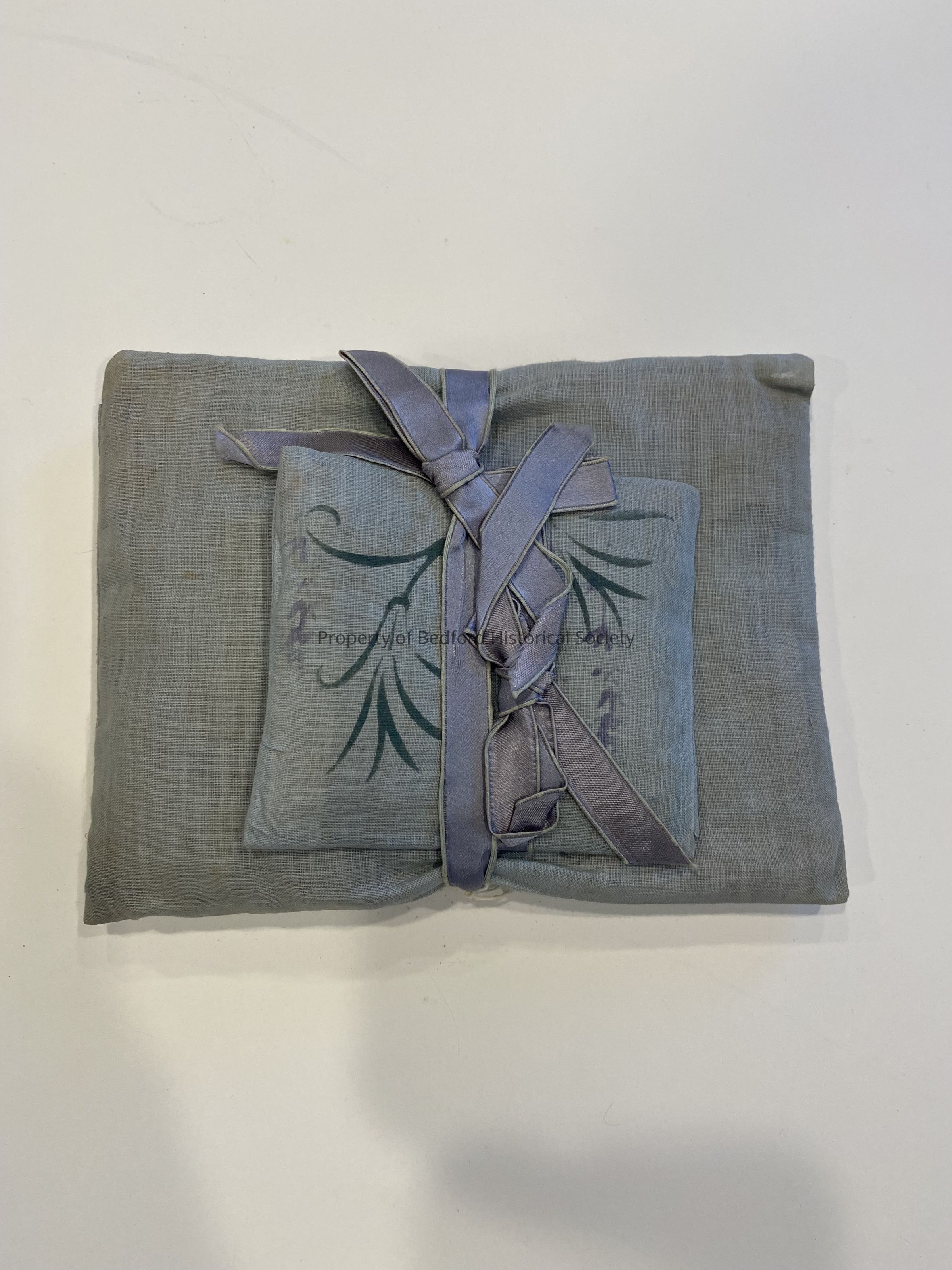 Two cloth potpouri cases tied with ribbon, the smaller one having floral design embroidery