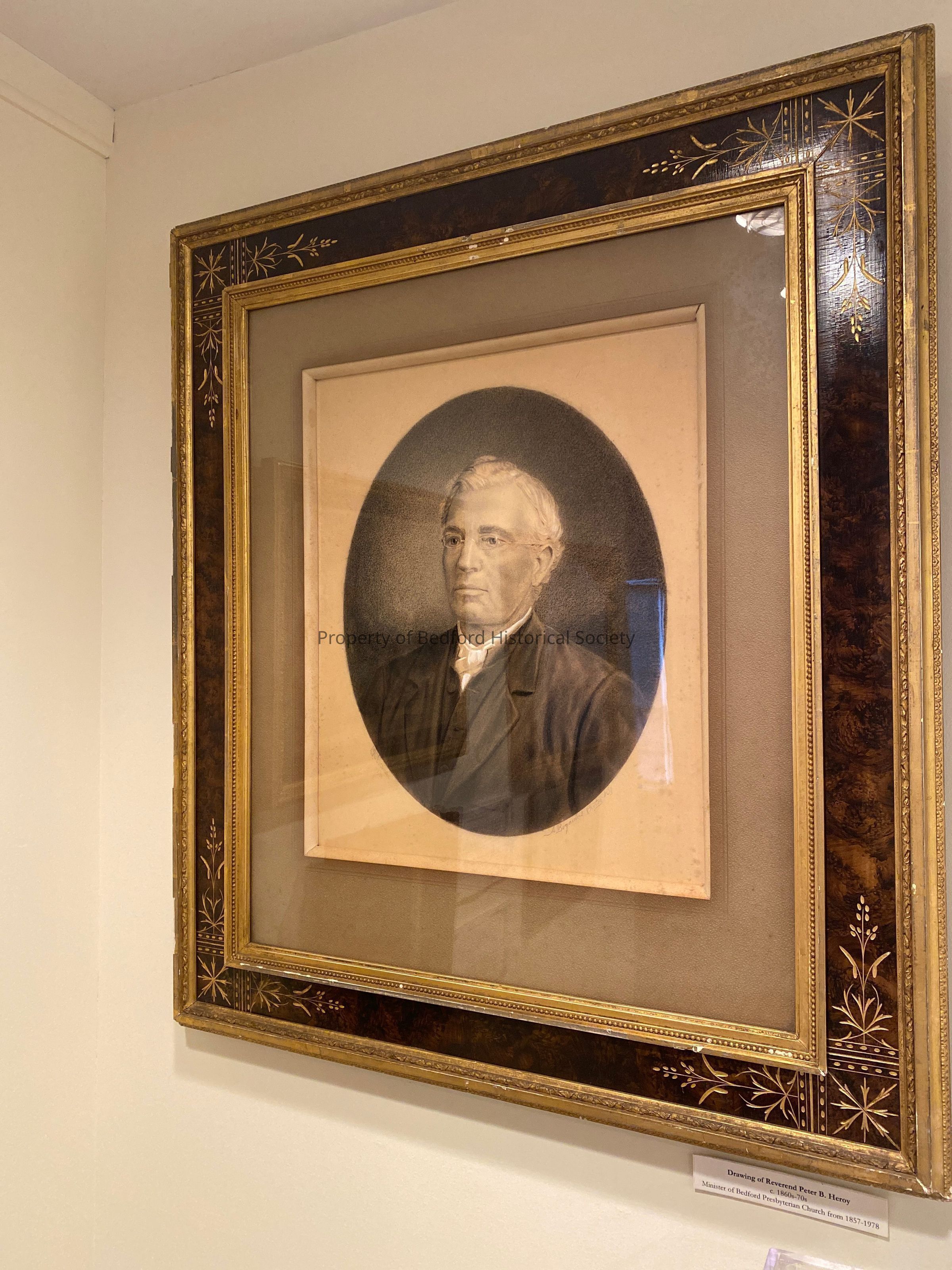 Framed drawing of Reverend Peter B. Heroy, minister of Bedford Presbyterian Church from 1857-1878, frame is wood with carved gold swirl design with gold interior and exterior border