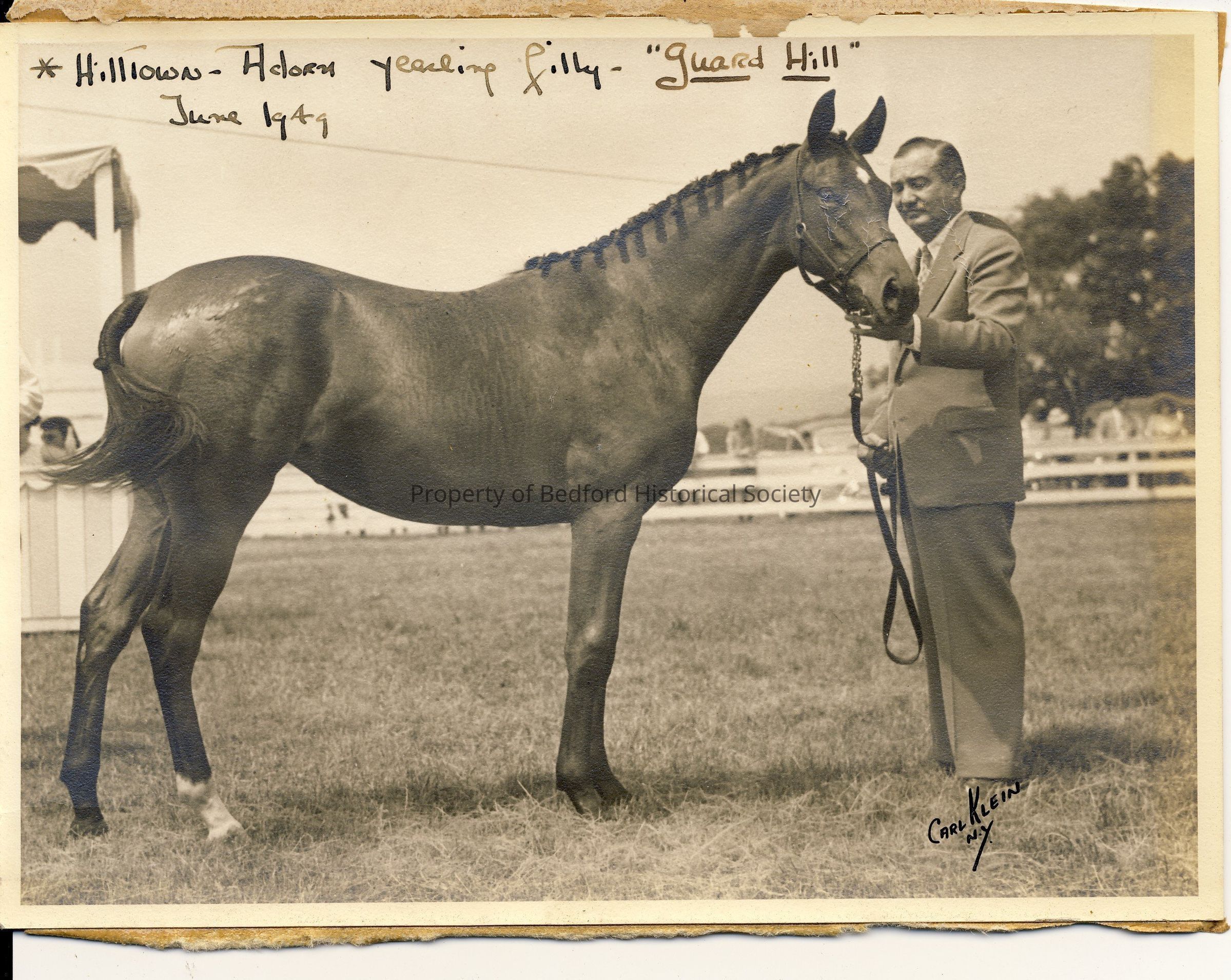 Man showing horse. written note: HillTown - yearling filly - "Guard Hill" june 1949