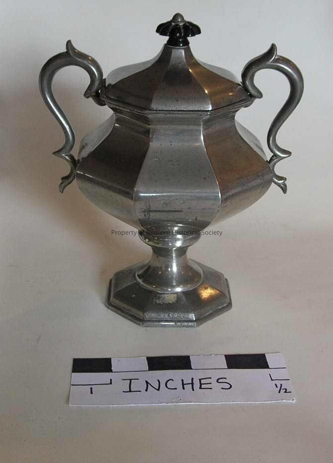 8" tall pewter sugar basin with separate cover and 8 petal black wood finial, by James Dixon & Sons, c.1841 Mate to X.58.2 Tea Pot