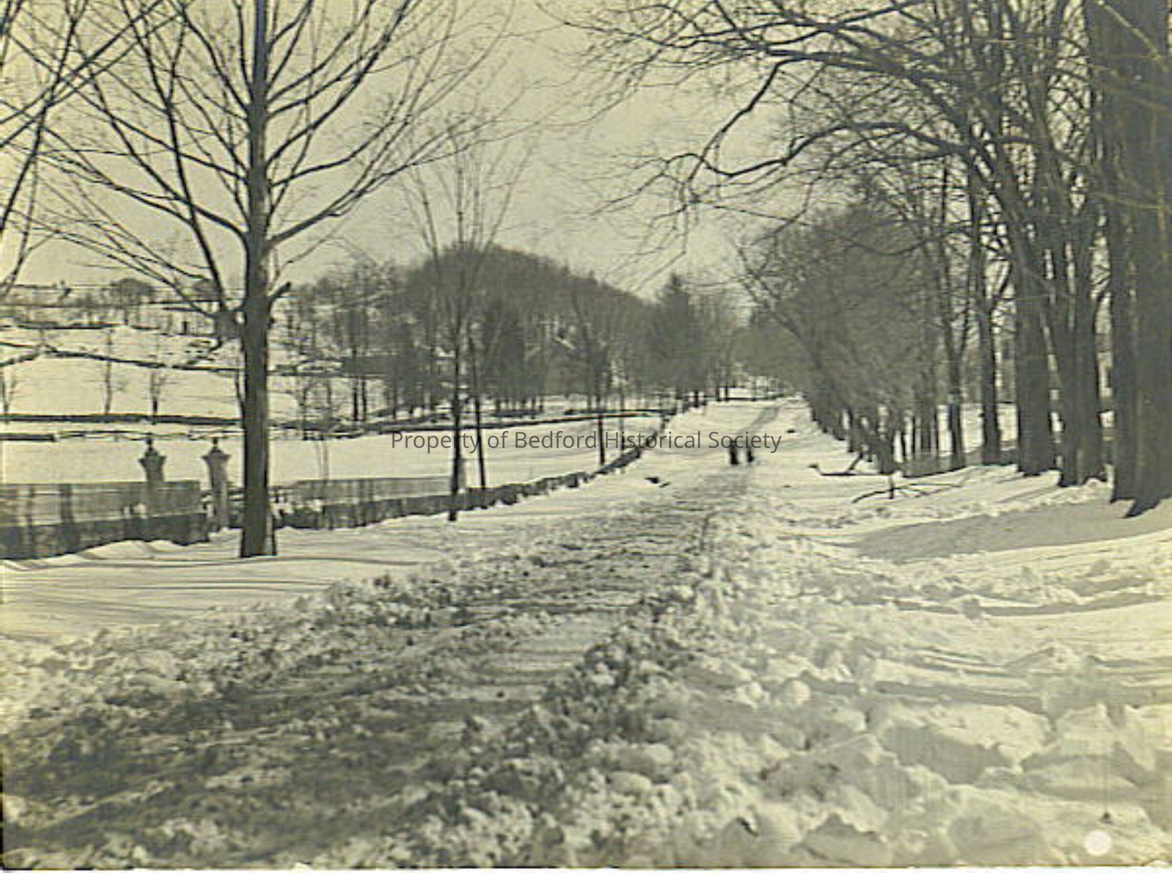 Pound Ridge Road in snow looking away from Village Green, Indian Hill on Left