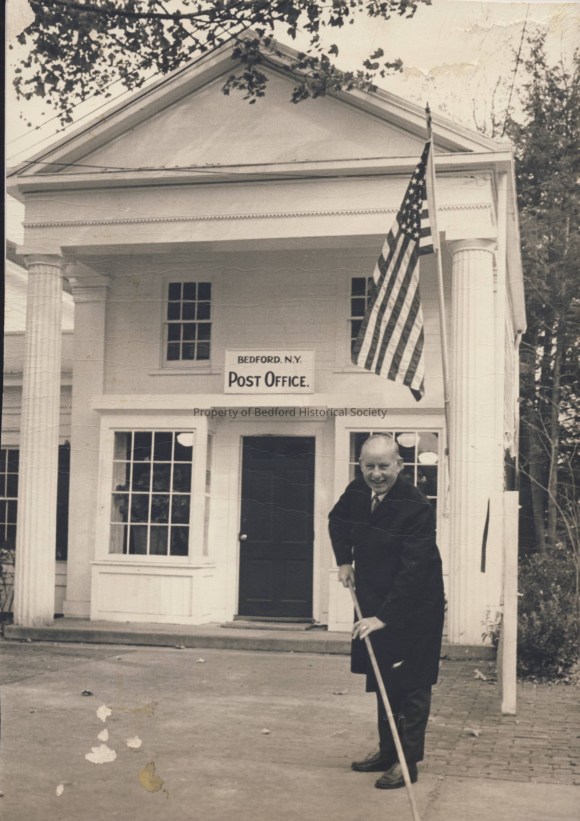 Black and white photo of Ernie ? in front of the Bedford Post Office. Has some damage in bottom left corner.