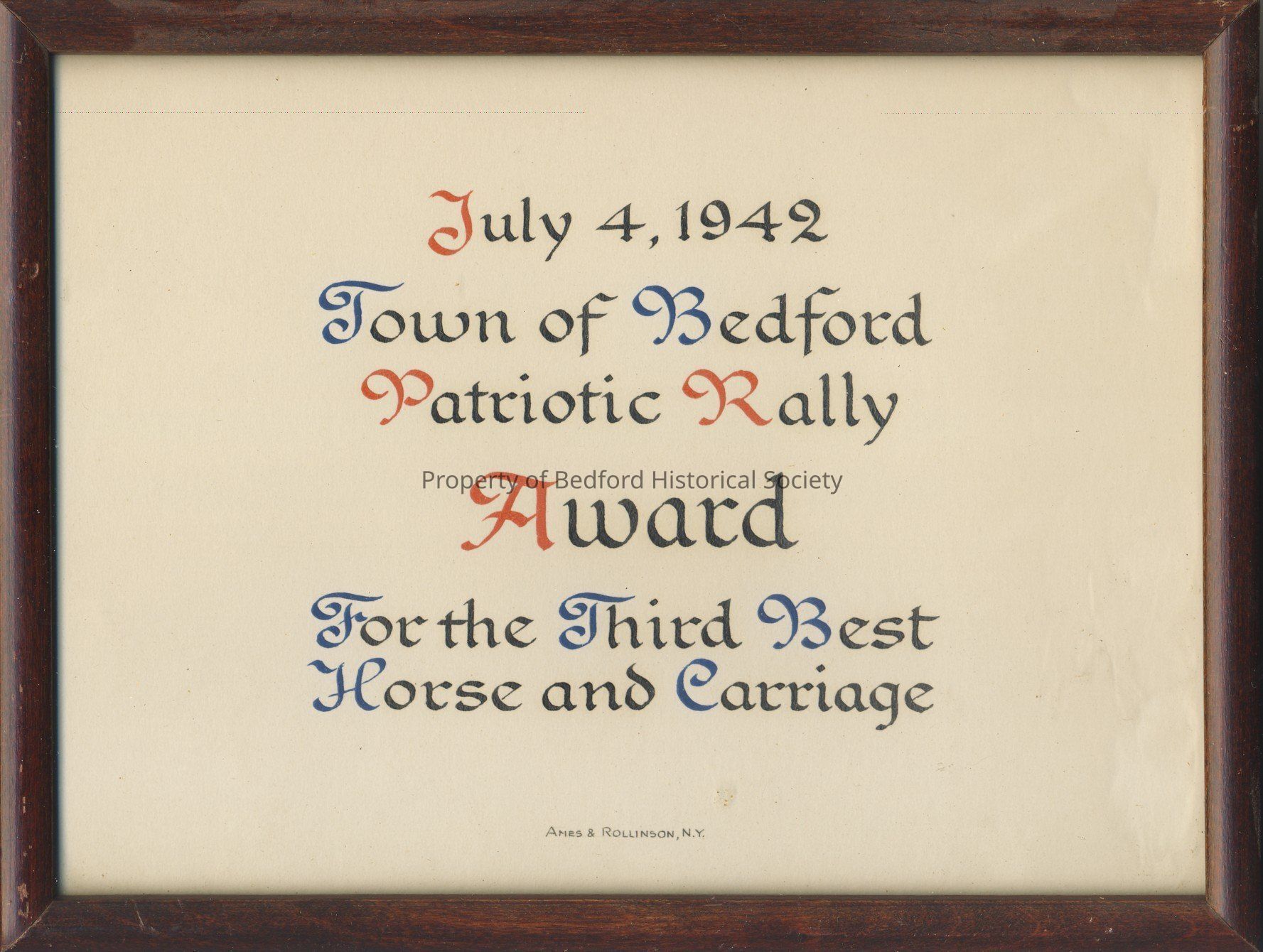 Award in frame. July 4, 1942. Town of Bedford Patriotic Rally, Award, For the Third Best Horse and Carriage.