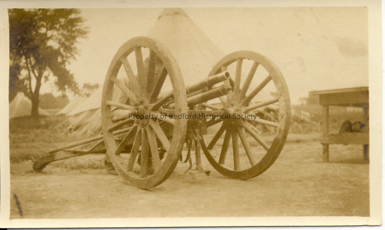 Large Gun on wheels. Back reads: Picture of the French 37mm. that we have to learn how to shoot the shell is 6in. long and 1 1/2 in in diameter, they are single shot they are for heavy "tanks" picture #3 is of the cassion which carry's the shells they are drawn by a horse