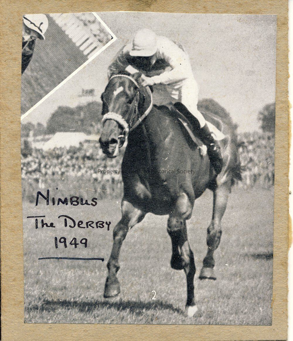 Newpaper photograph of horse and rider. Nimbus. The Derby 1949