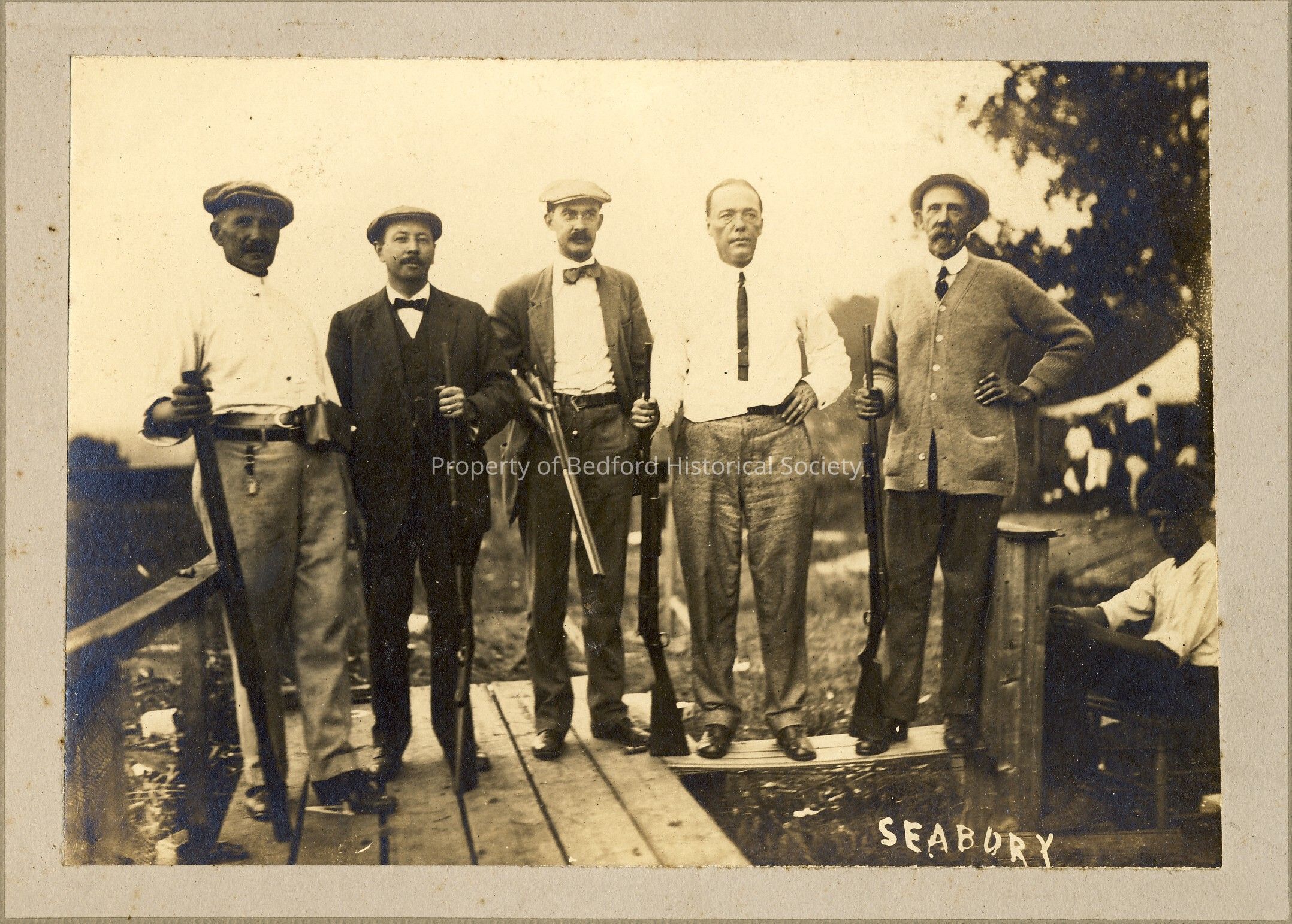Possible Marsh family men, holding guns on a dock