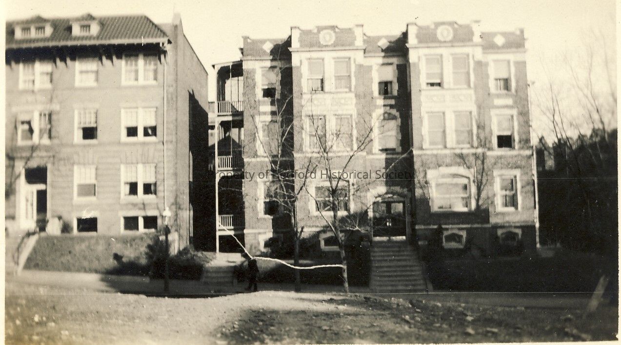 B & W photograph of an apartment building, shot horizontally