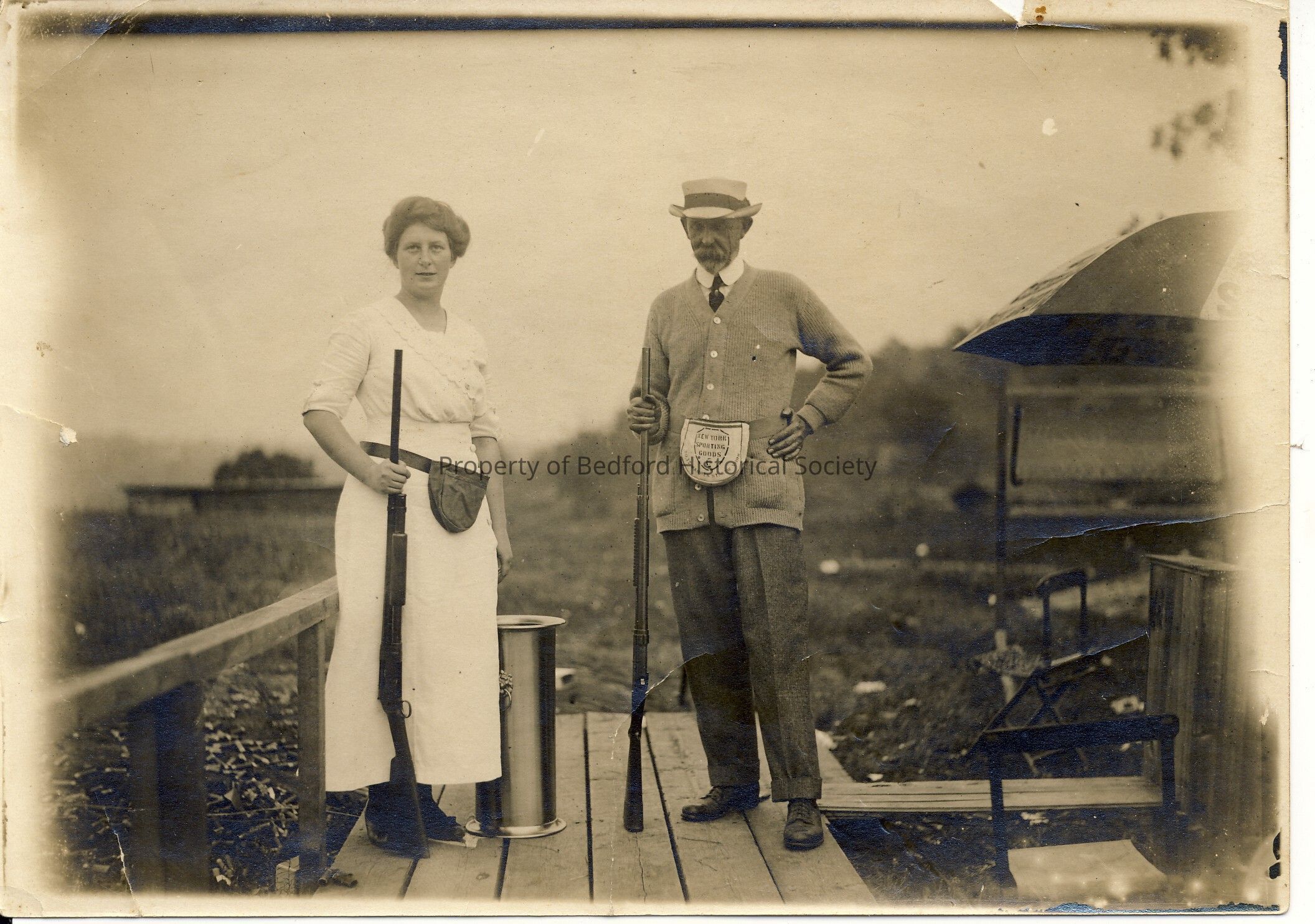 Man and woman each holding a gun, on a dock