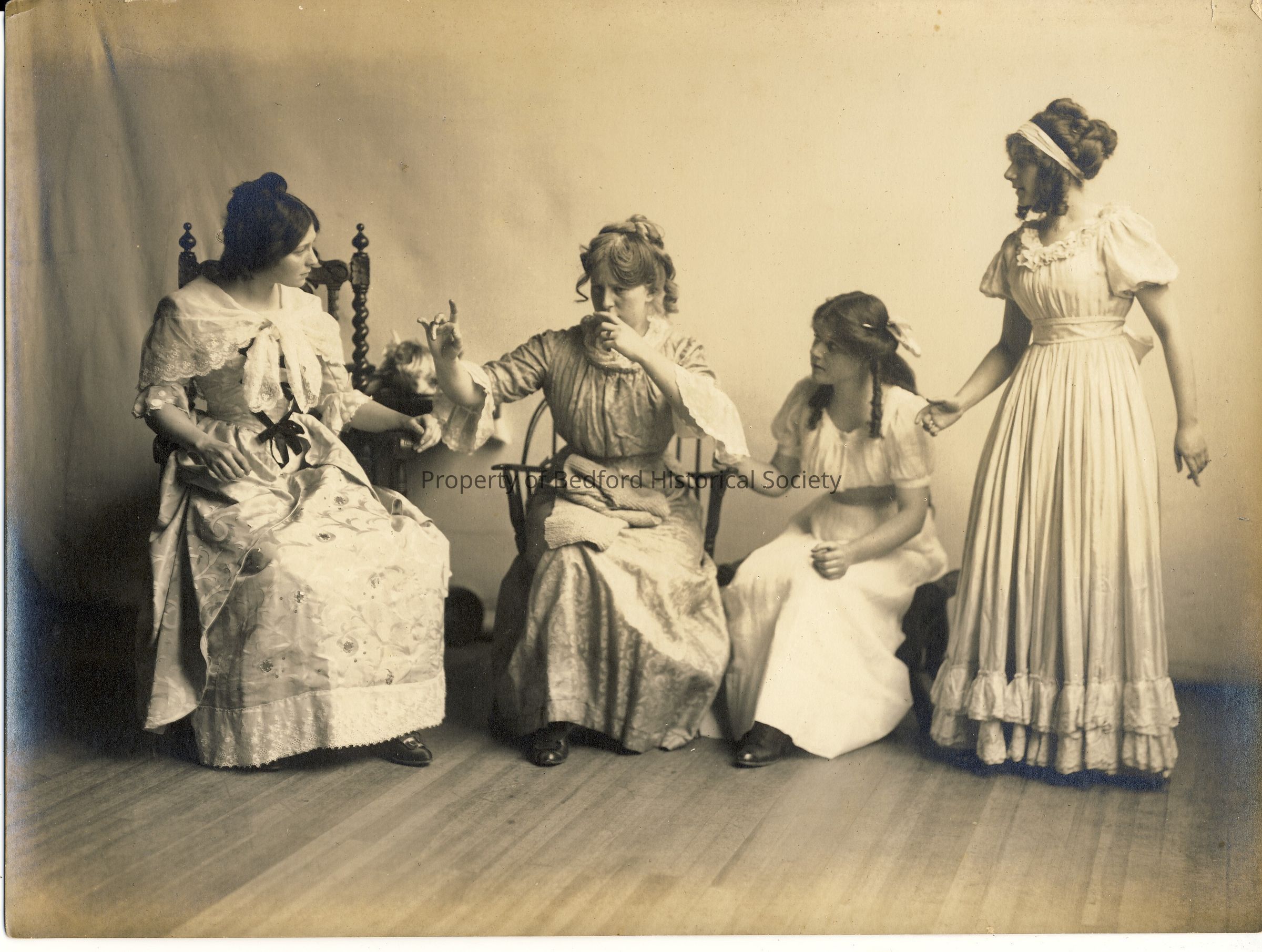 4 girls posed, dressed in costume, B & W photograph