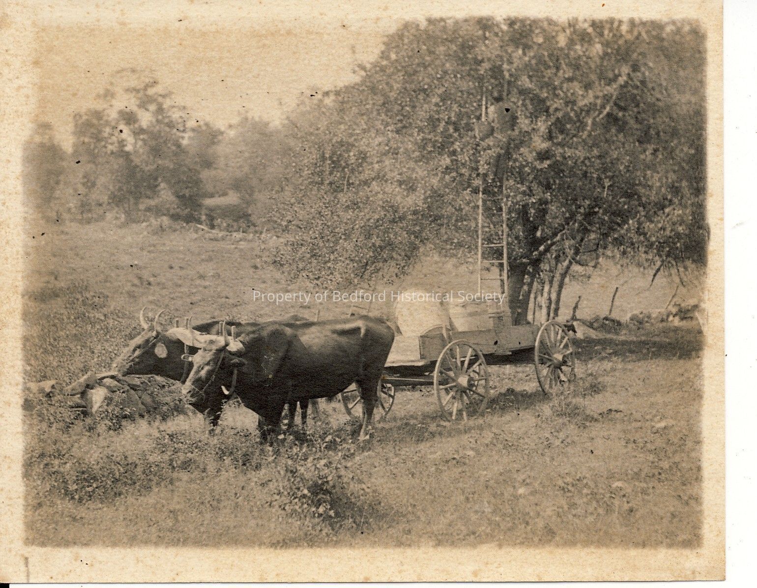 Two oxen pulling a cart, man on a ladder up in a tree.