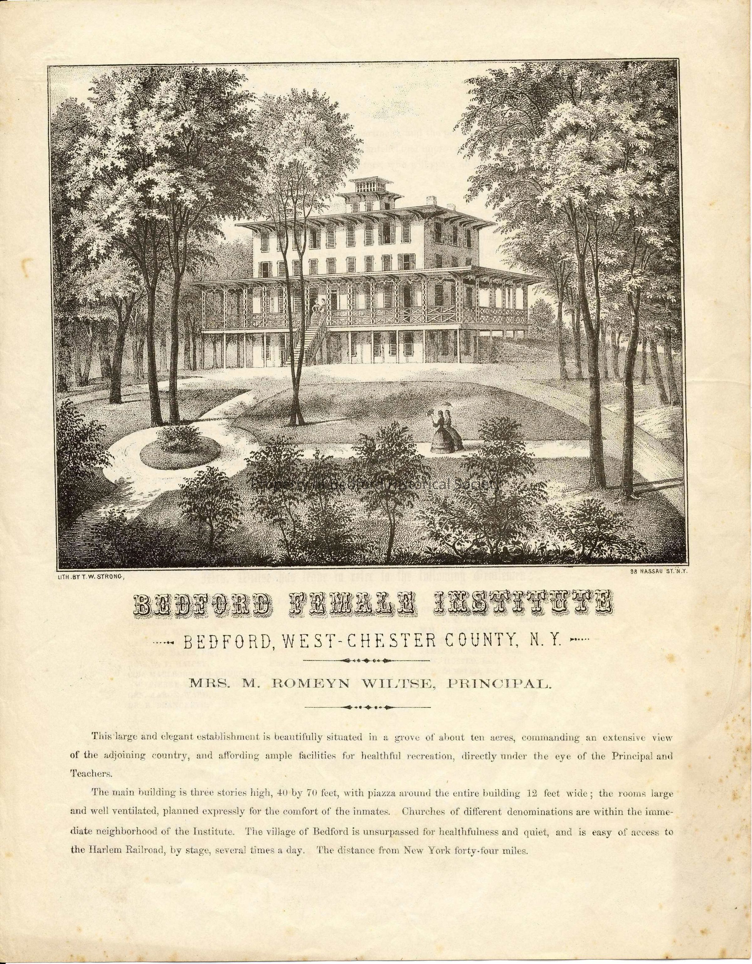Printed Brochure for Bedford Female Institute, with picture of building, Mrs. M. Romeyn Wiltse, Principal