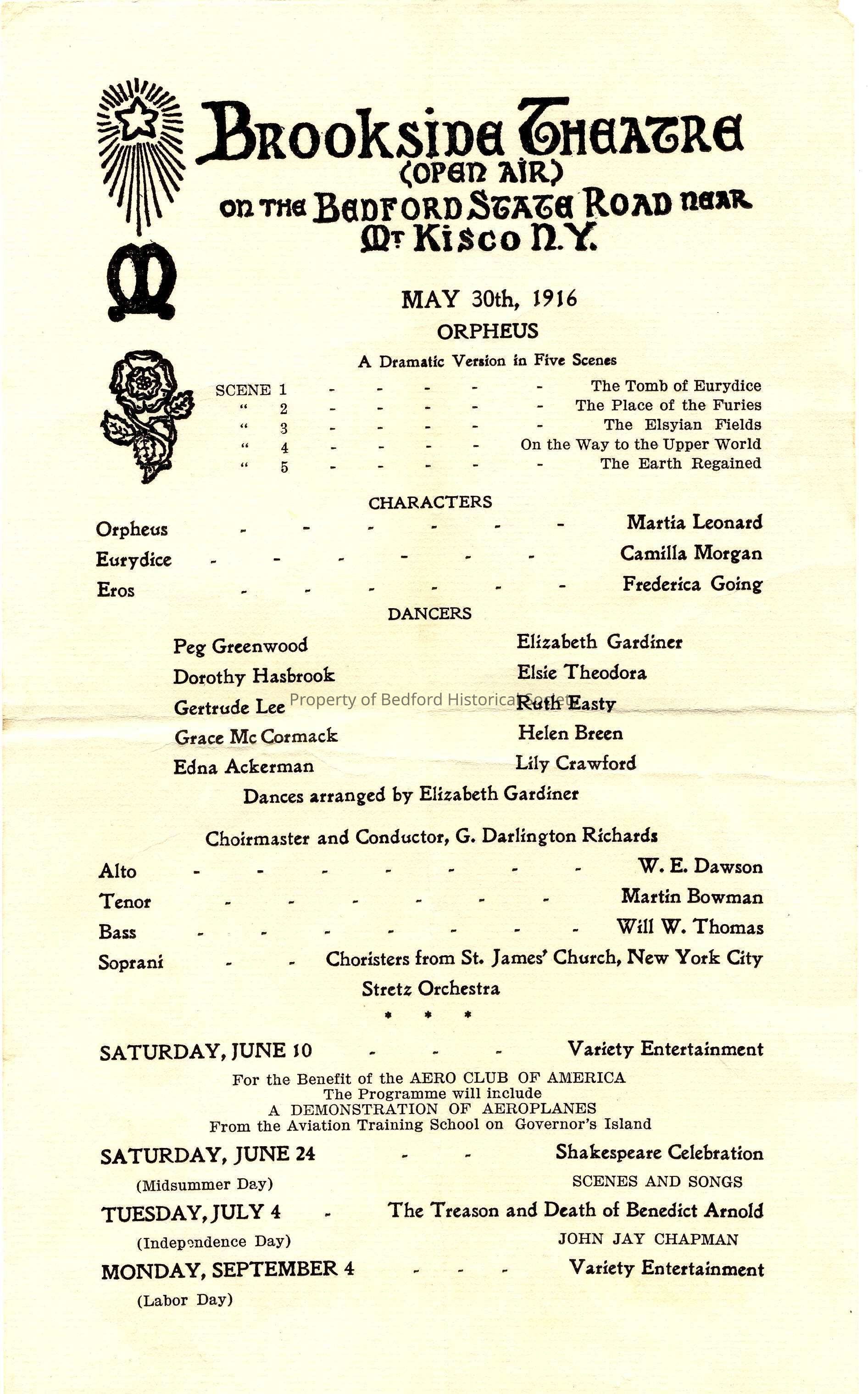 Program for the Brookside Theatre on the Bedford State Road, 1916