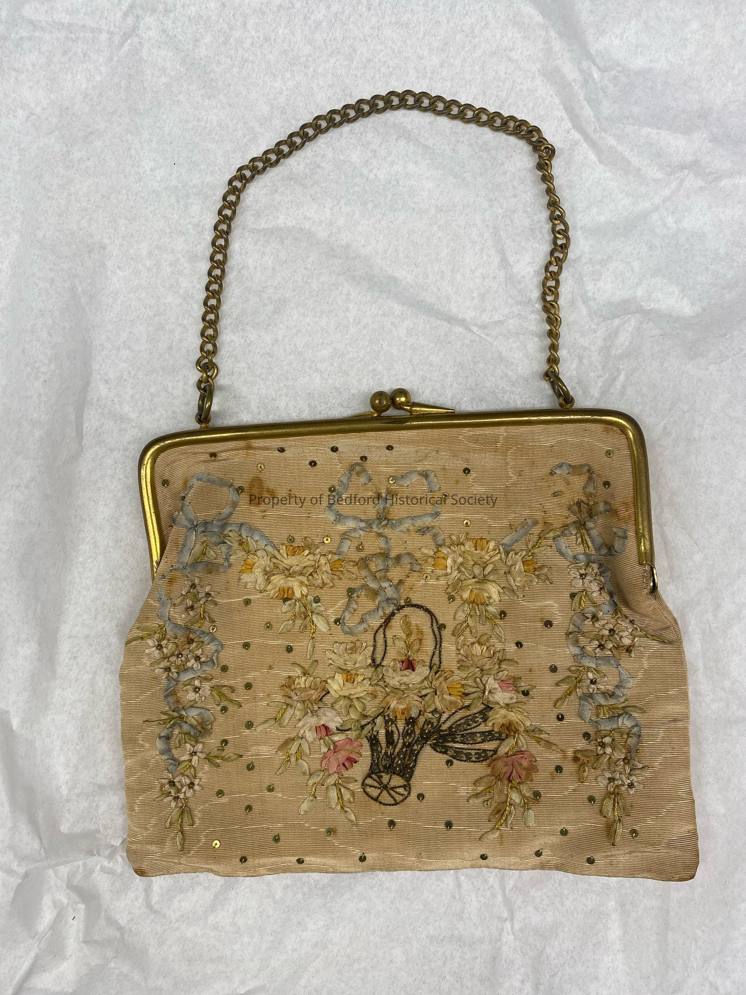 embroidered purse with elaborate basket, ribbon and floral design in pink, yellow and blue on beige background, brass frame and chain