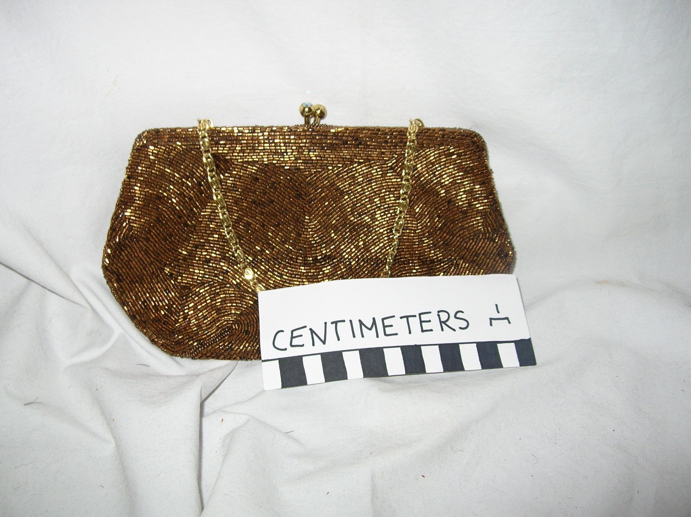 Dark gold beaded handbag with gold tone chain strap. crystals on the ball clasp.