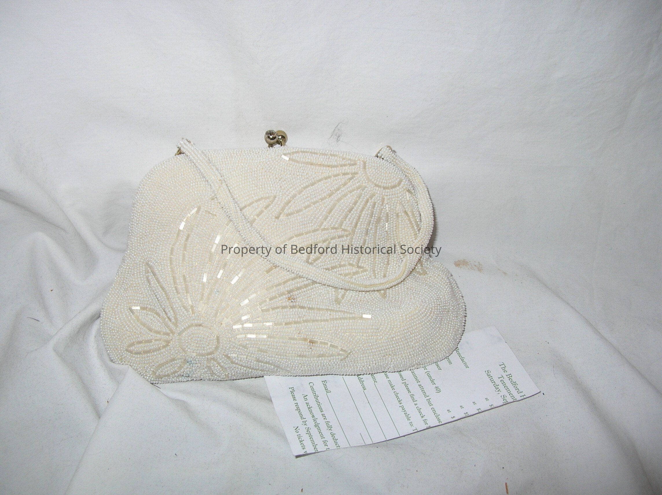 White beaded handbag with white beaded strap, crystal clasp (one stone missing) Small loose mirror inside with "La Regale" on it.