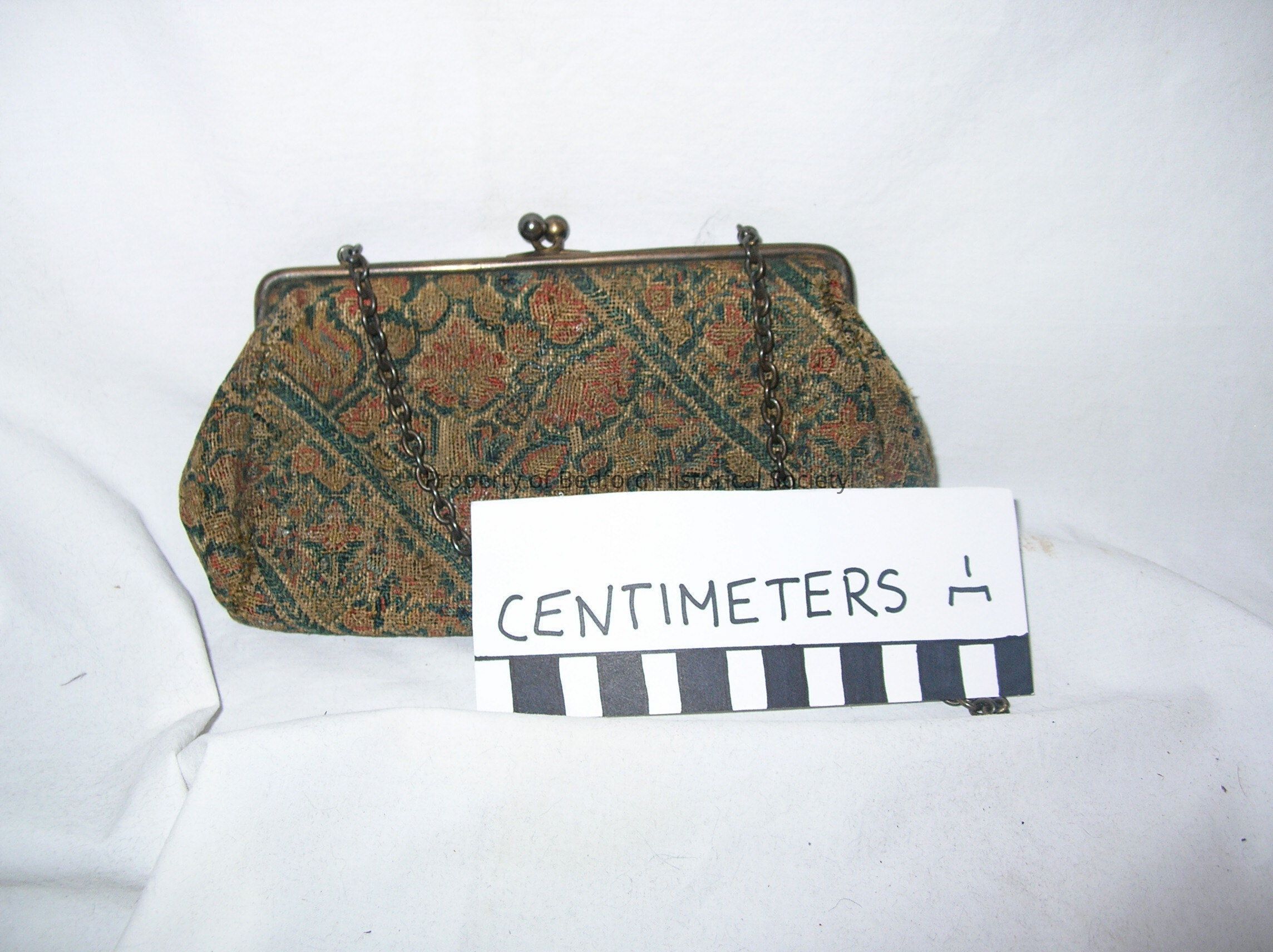 Small handbag with multi-colored fabric (red, green, and gold). bronze toned hardware and chain strap.