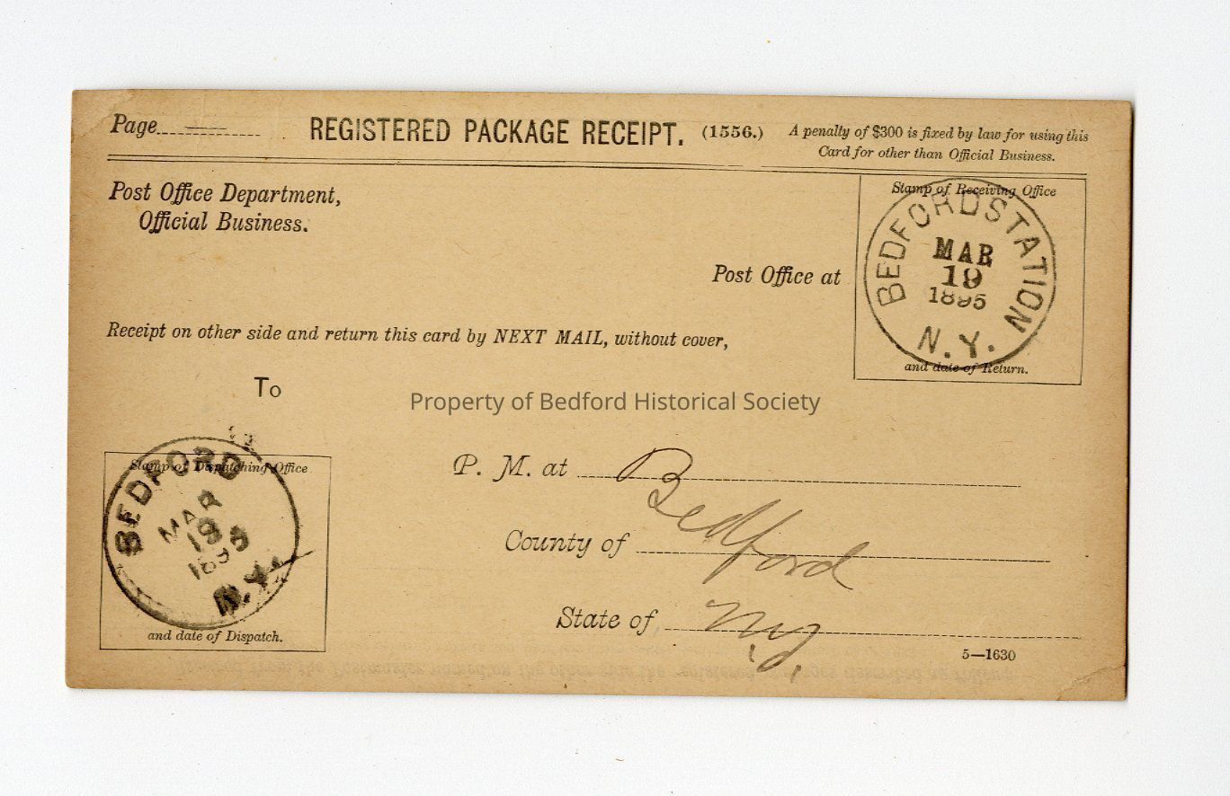 registered package receipt from Bedford, New York to N.Y.C. stamped March 19, 1895, signed by W.N. Harris
