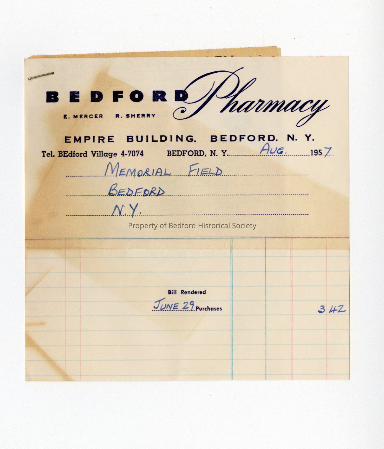 Receipt from Bedford Pharmacy to Memorial Field for $3.42, August 1957