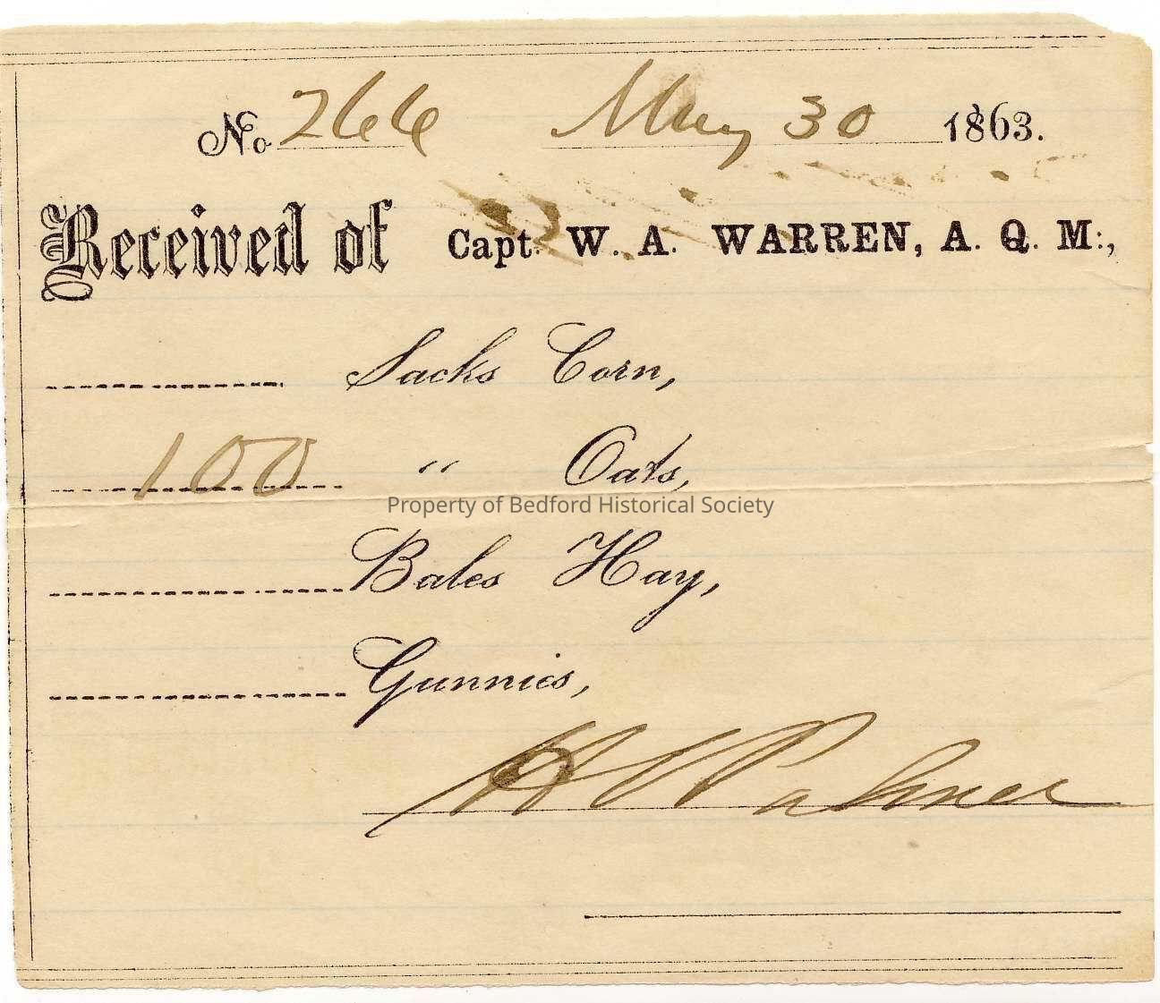 Receipt for 100 sacks of Oats received of Captain W.A. Warren,, signed by Henry Palmer, 1863