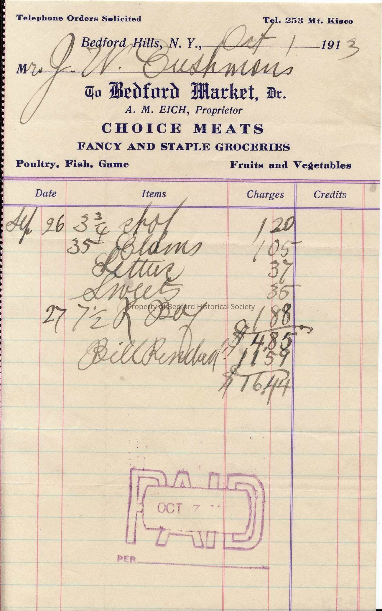 Receipt for Joseph Cushman from Bedford Market, 1913