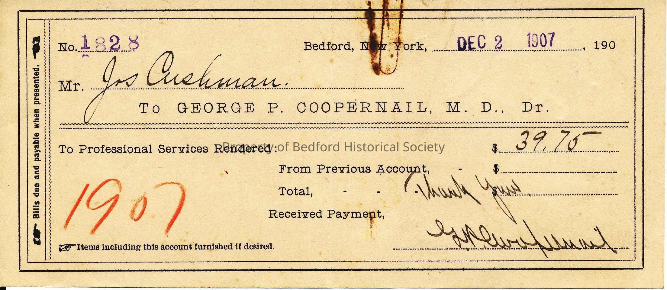Receipt for Joseph Cushman from Dr. George Coopernail, 1907