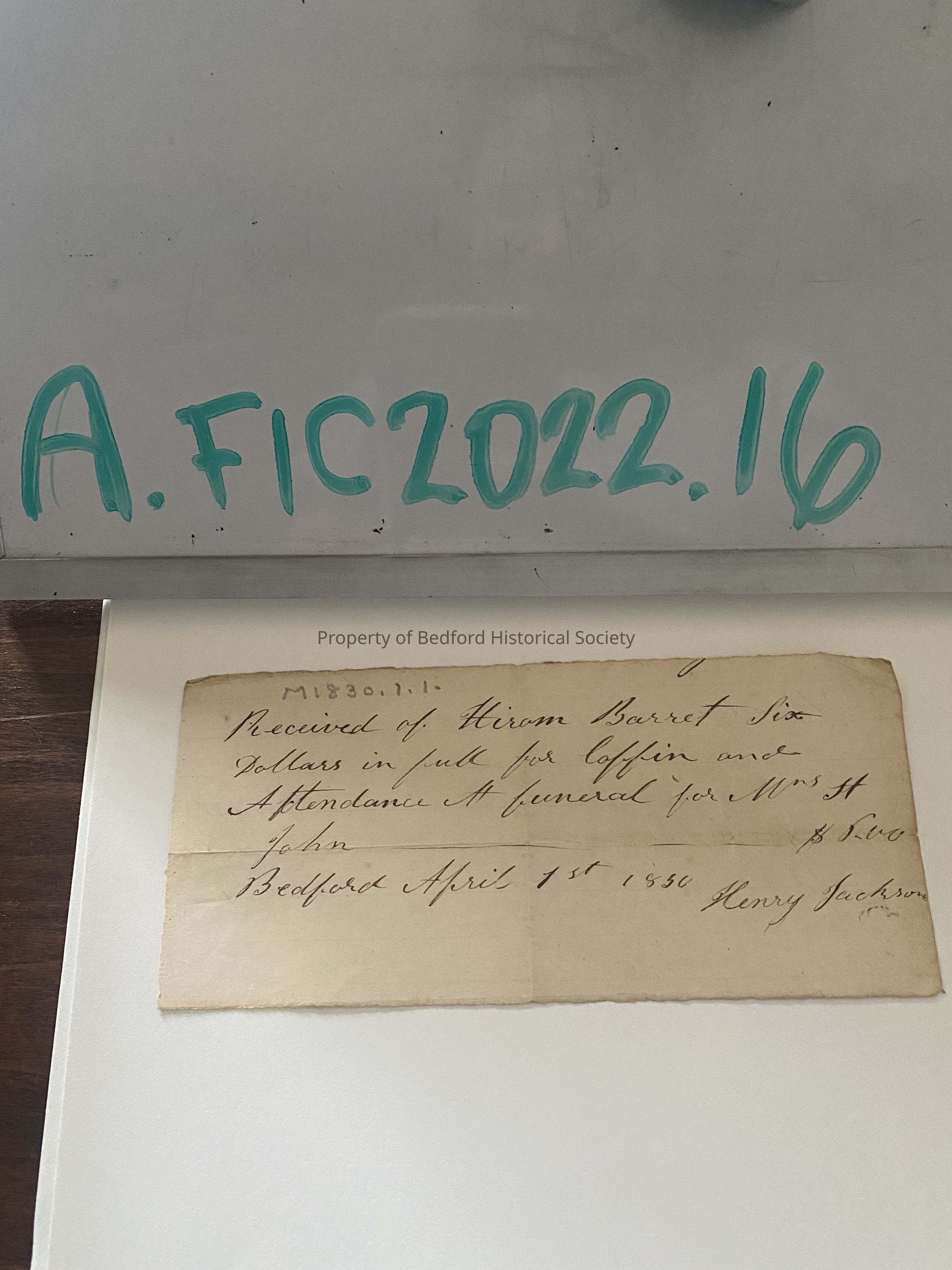 "Received of Hiram Barrett six dollars in full for coffin and attendance of funeral for Mrs H John, Bedford April 1 1830
