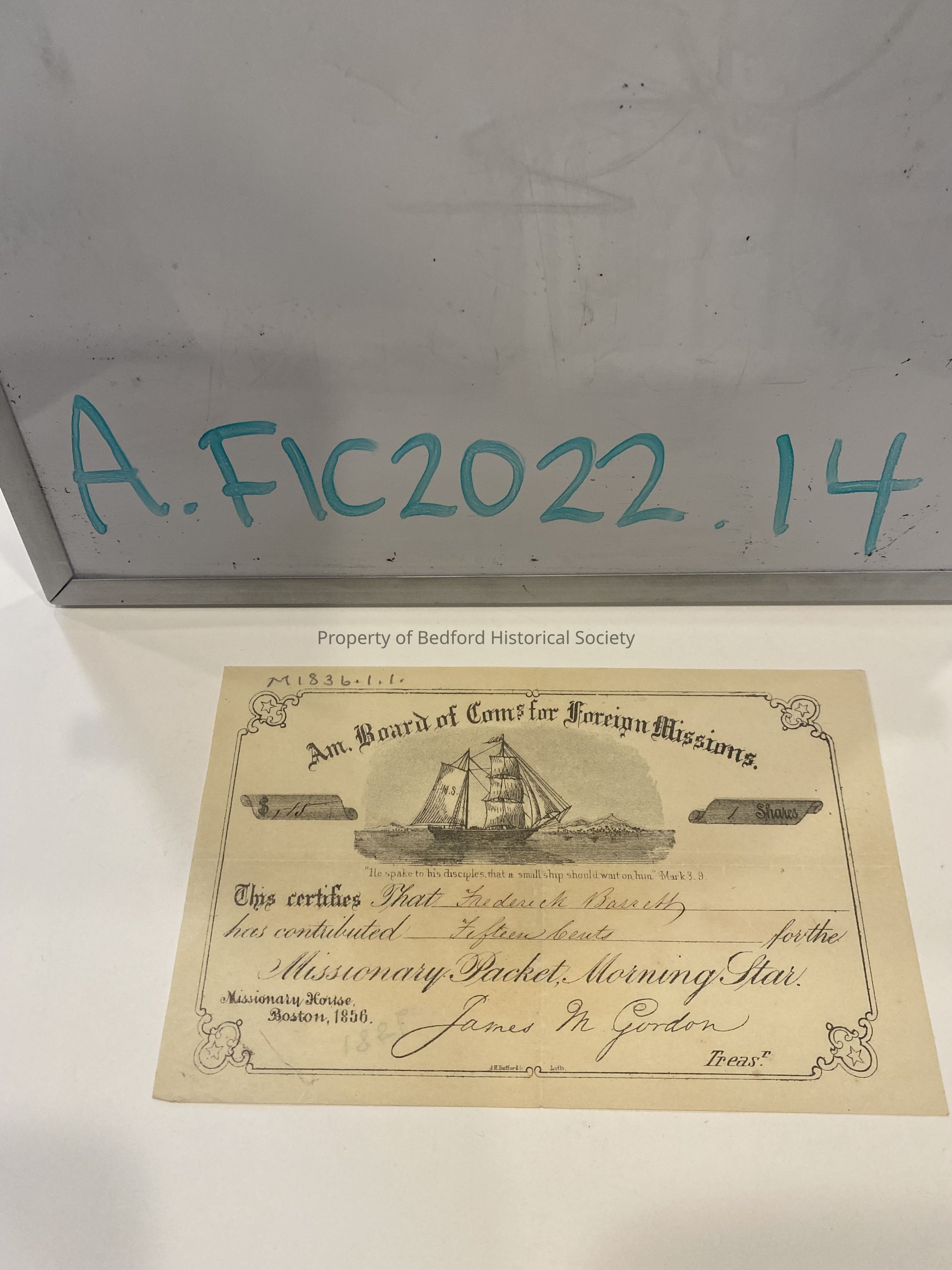 reciept or certificate made out to Frederick Barrett for contribution of fifteen cents to the Missionary Packet, Morning Star signed by James M. Gordon