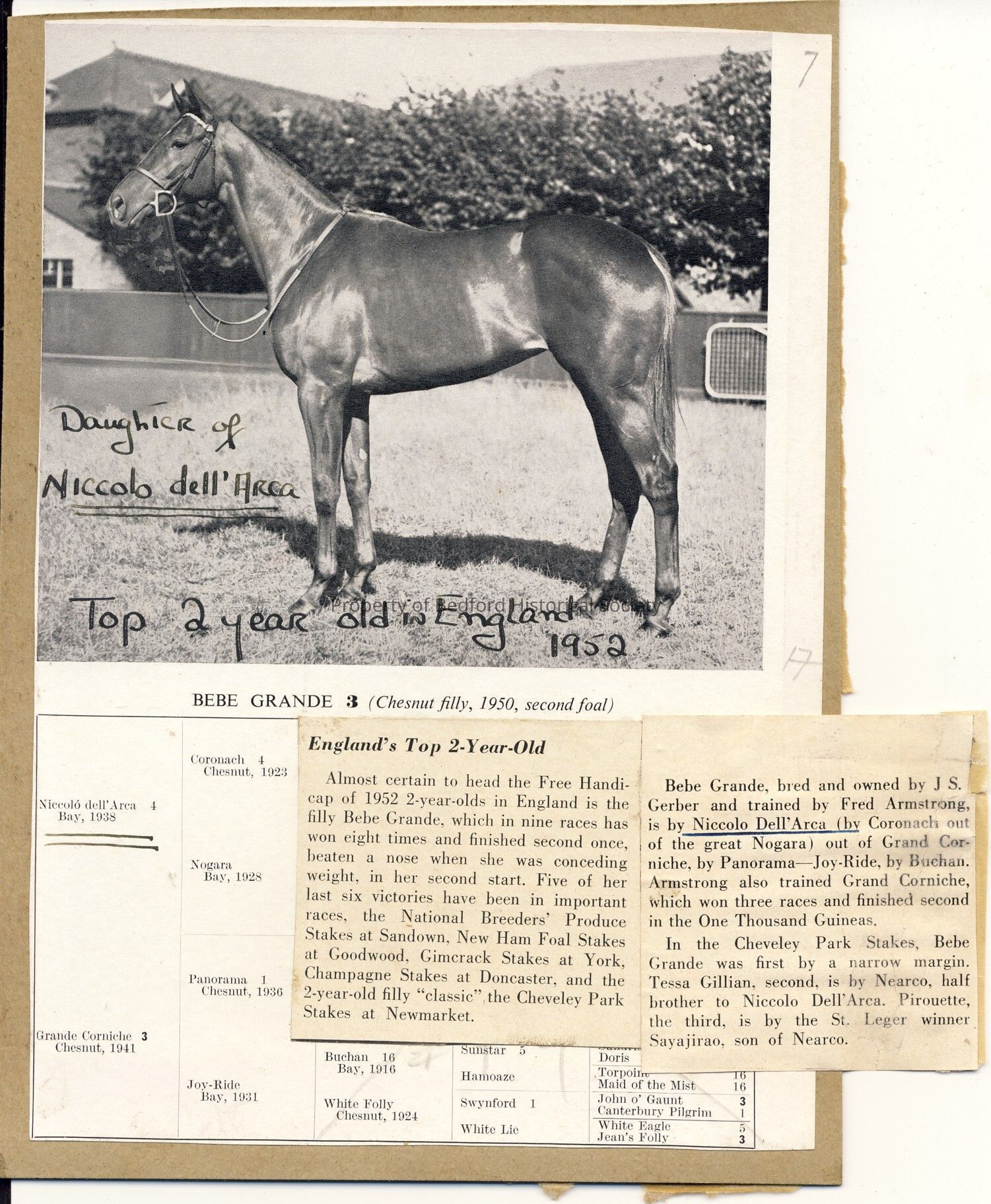 B and W photograph of horse. with horse lineage attached. Bebe Grande, Daughter of Niccolo dell'Arca. (Chesnut filly, 1950, second foal)
