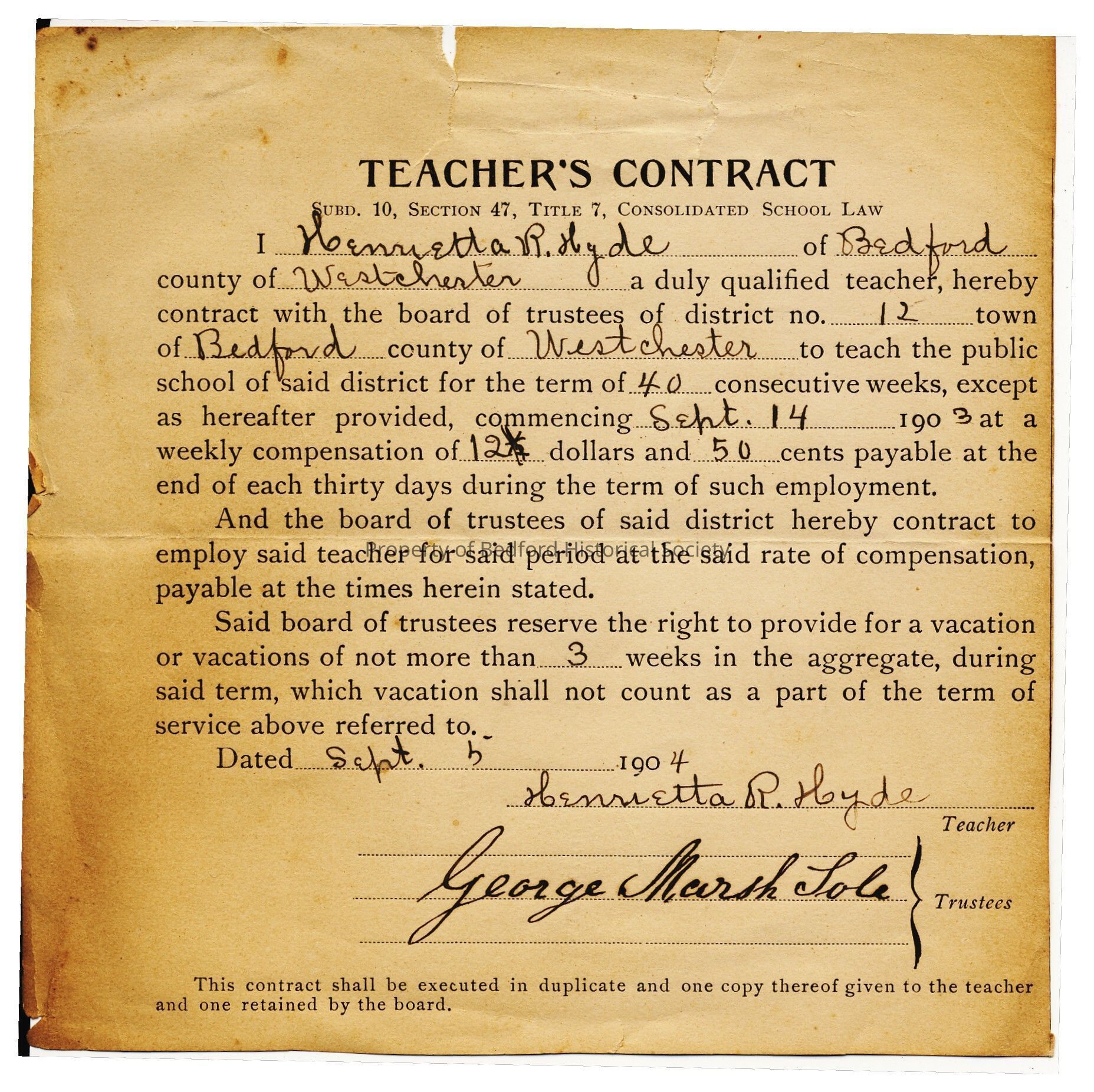 Teacher Contract. Henrietta R. Hyde, to teach for 40 weeks starting Sept 14, at 12 dollars and 50 cents at the end of each 30 days. 3 weeks vacation. Sept 5, 1904