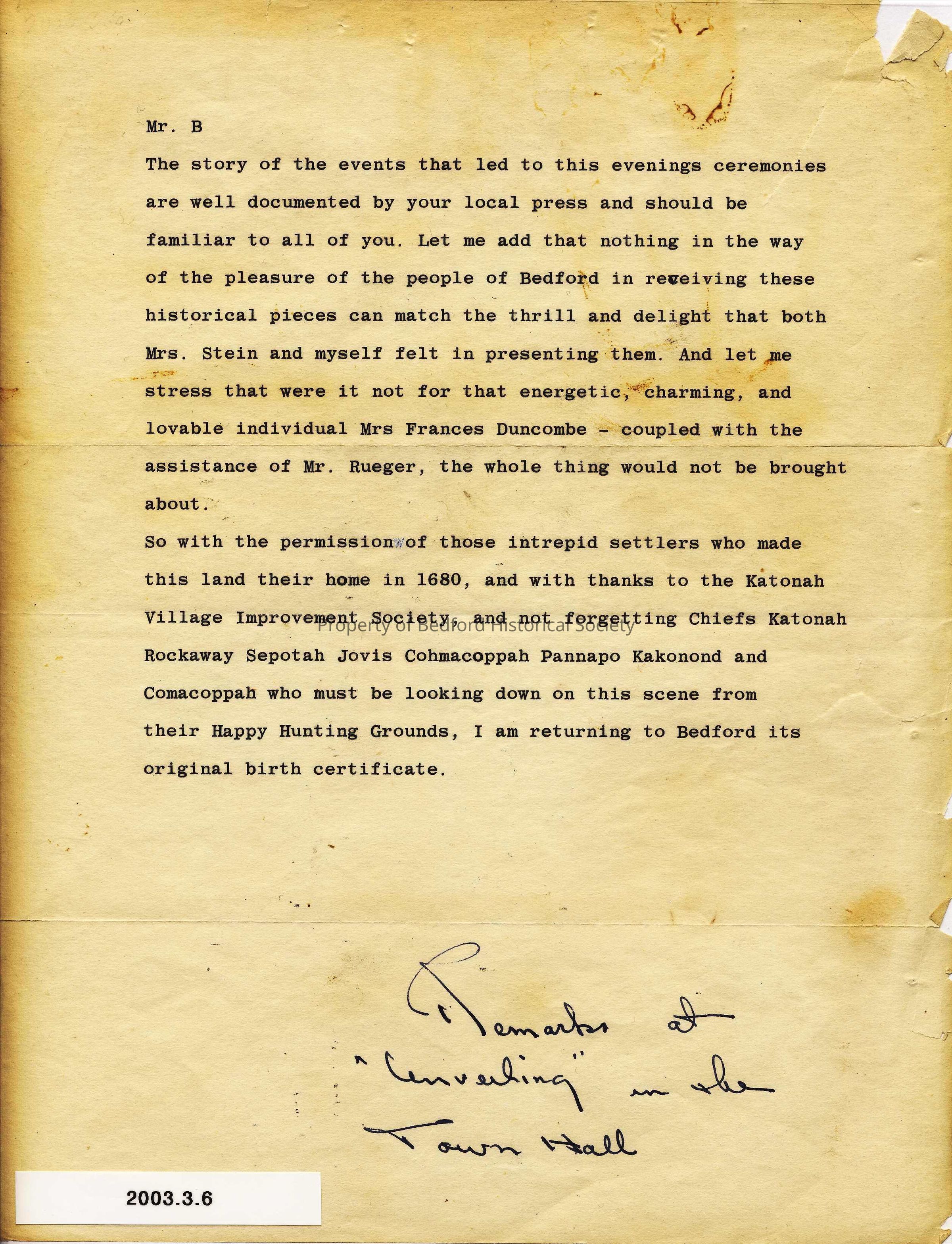 Remarks by Mr. Nathaniel Stein at the "unveiling" of the original Bedford Deed at Town Hall, 1961