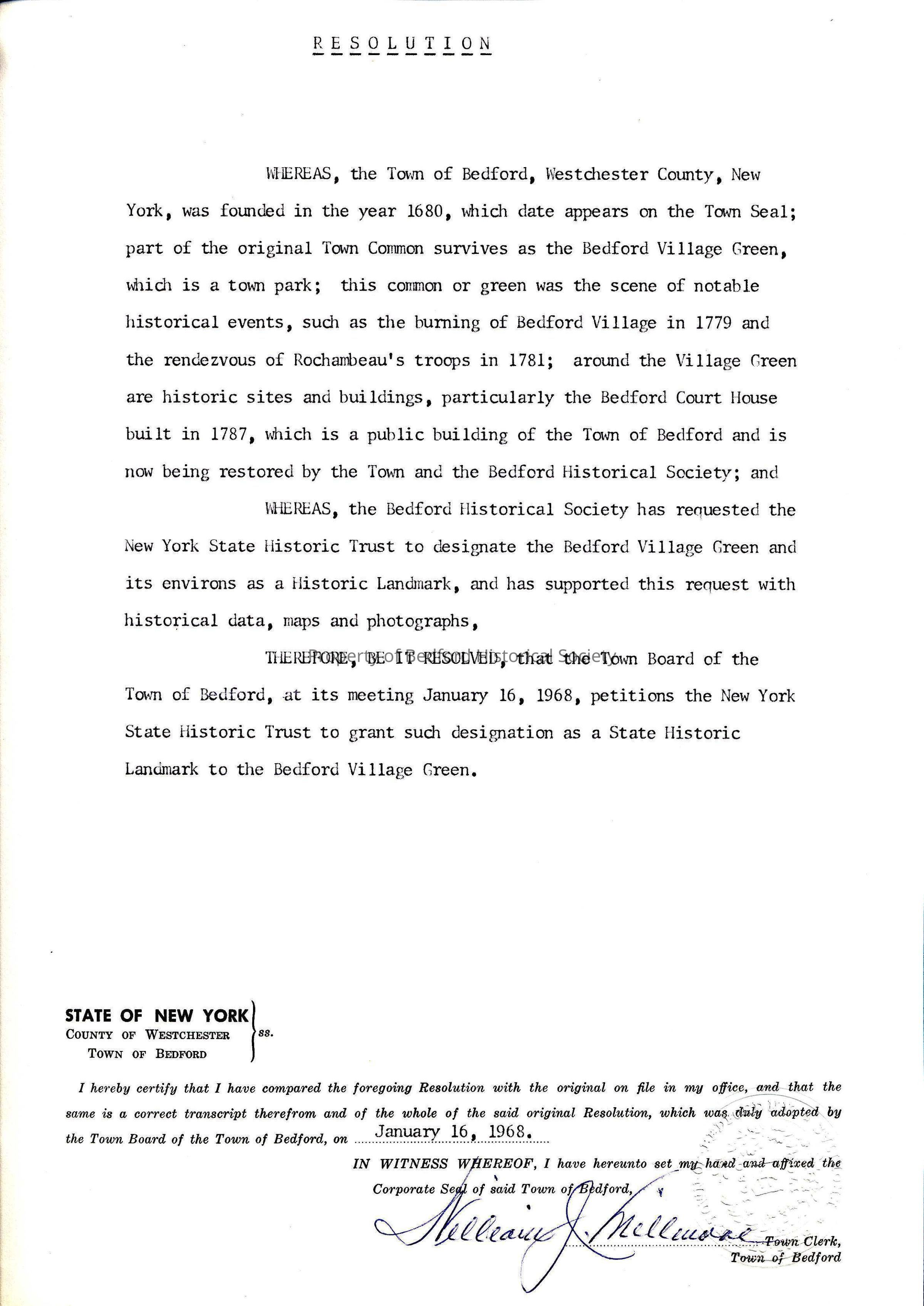 Resolution of the Bedford Town Board to seek status as a State Historic Landmark, 1968 *two copies