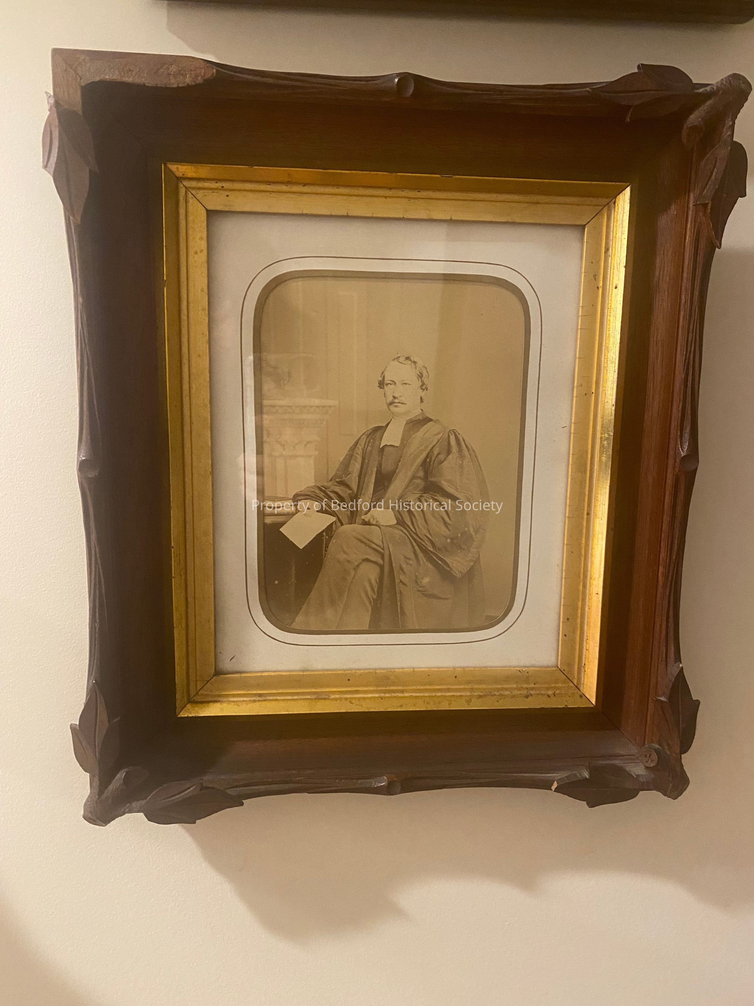 photograph of Reverend David C. Lyon, Minister of the 3rd Bedford Presbyterian Church from 1852-1857, pictured sitting in religious robes, photograph placed inside rectangular matte, framed in decorative carved brown wooden frame with leaf carving embellishment on each corner with inner gold border