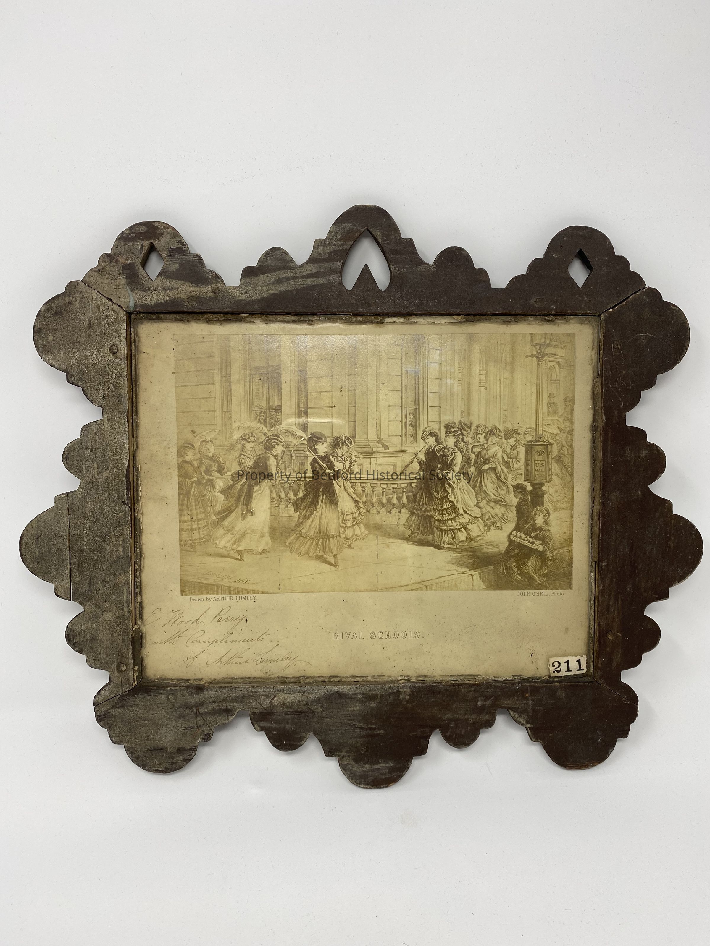 print framed in curving decorative wooden frame, having top border pierced with upside down heart in center, and diamond cutouts on each side. Print shows drawn image of two sets of girls in 1870's clothing, with printed "Rival Schools" underneath