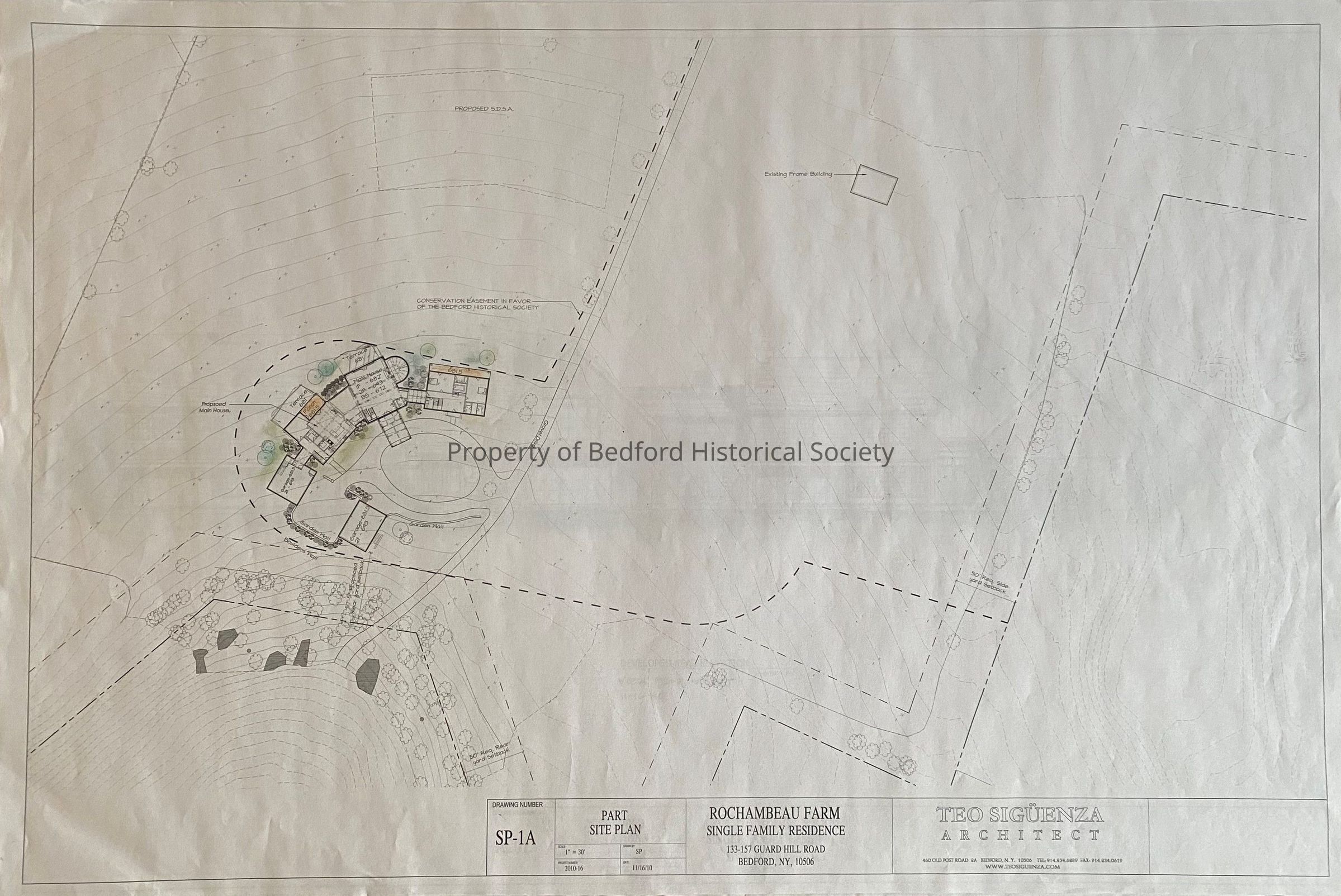 Plans for Rochambeau Farm single family residence on 133-157 Guard Hill Road. Teo Siguenza Architect. 6 pages, two mounted on poster board
