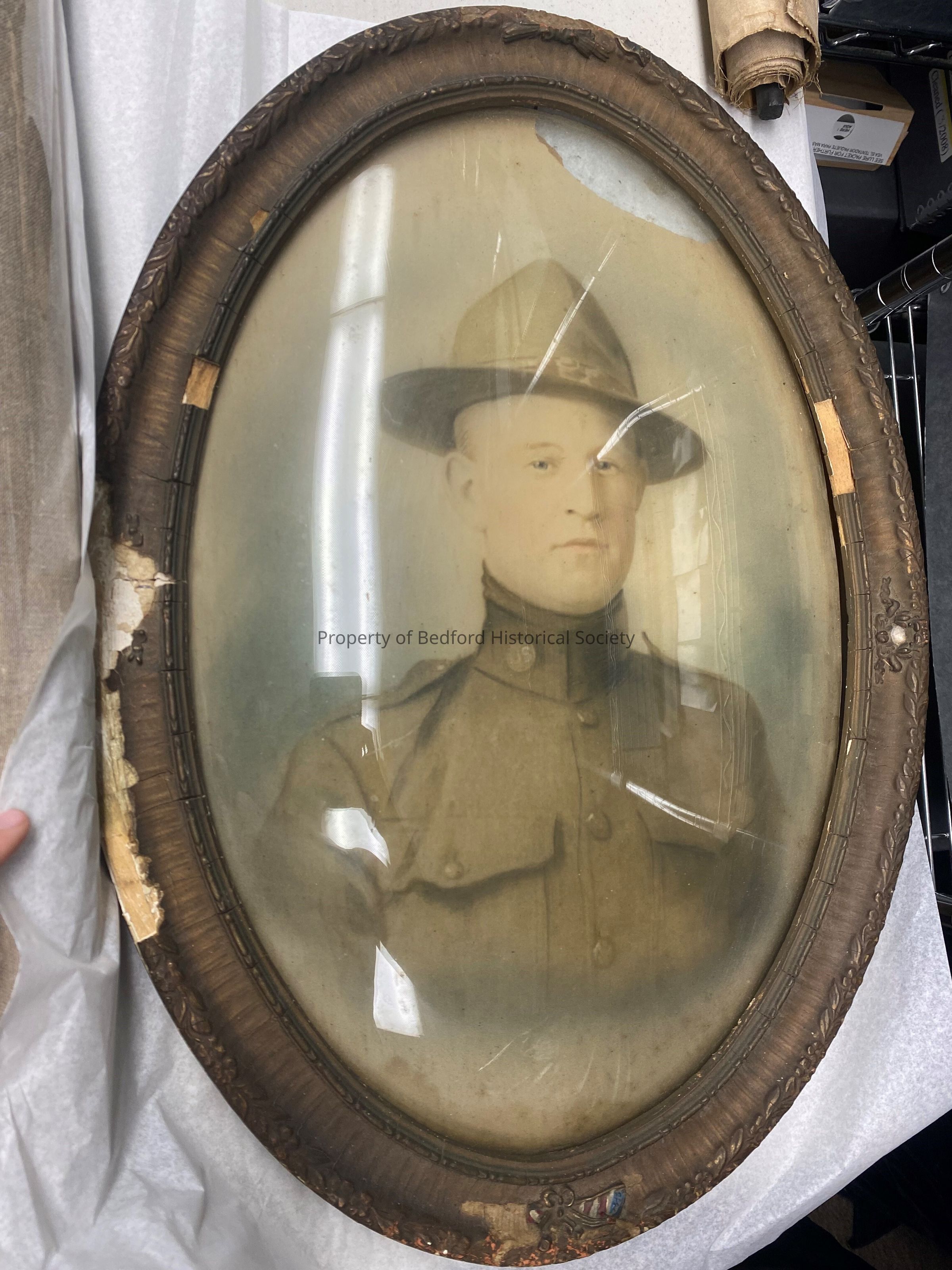 A framed oval hand colorized photograph of Romer J Myers in uniform