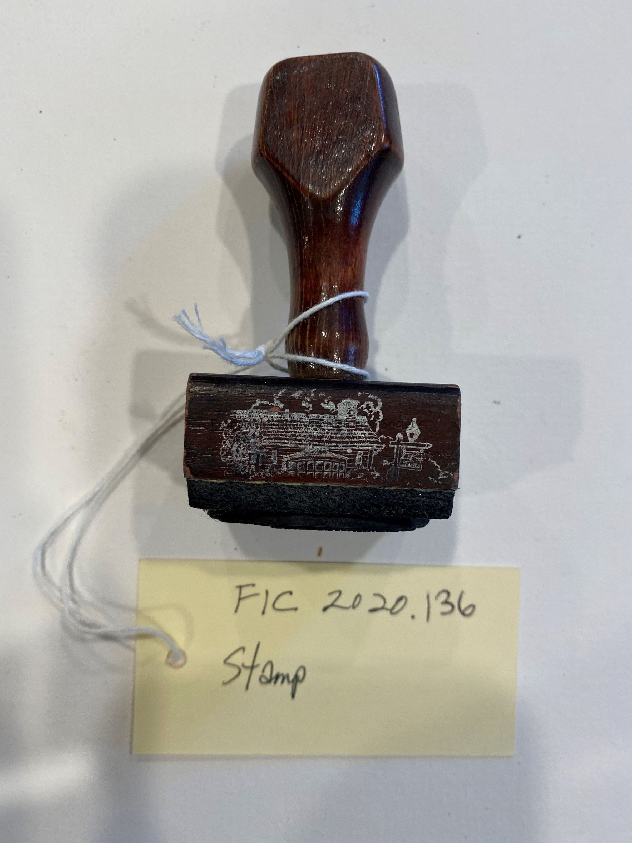 Brown wooded rubber stamp with handle, design of house with long bay window, garden, and sign with gas light on handle