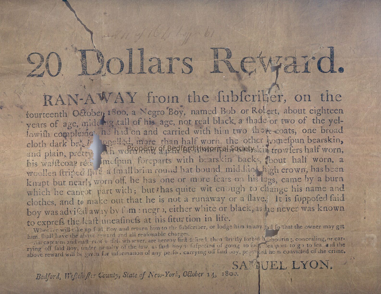 Ad place in paper by Samuel Lyon Date 1800. 20 Dollars Reward for the return of a runaway slave. Some foxing and torn places, nicely framed so both sides of the paper can be seen.